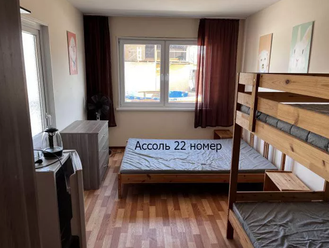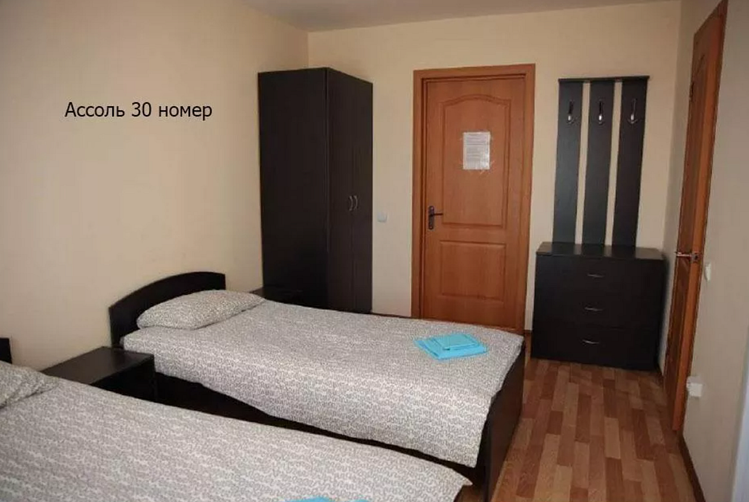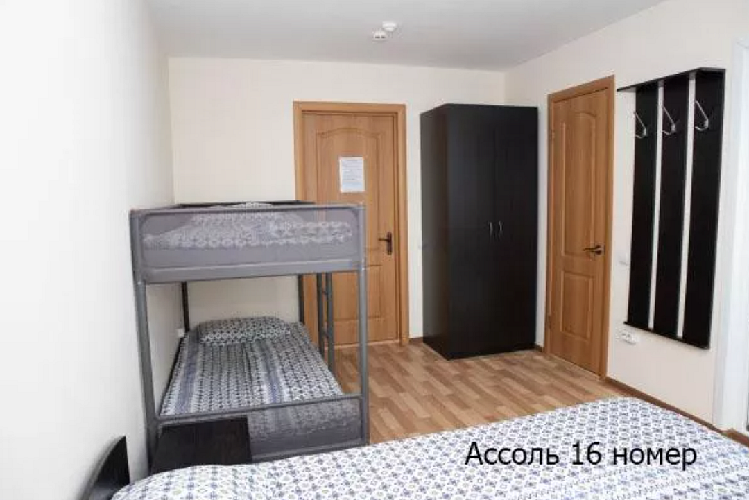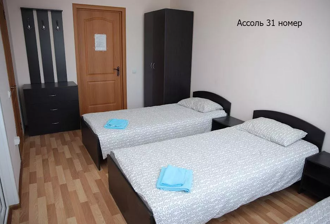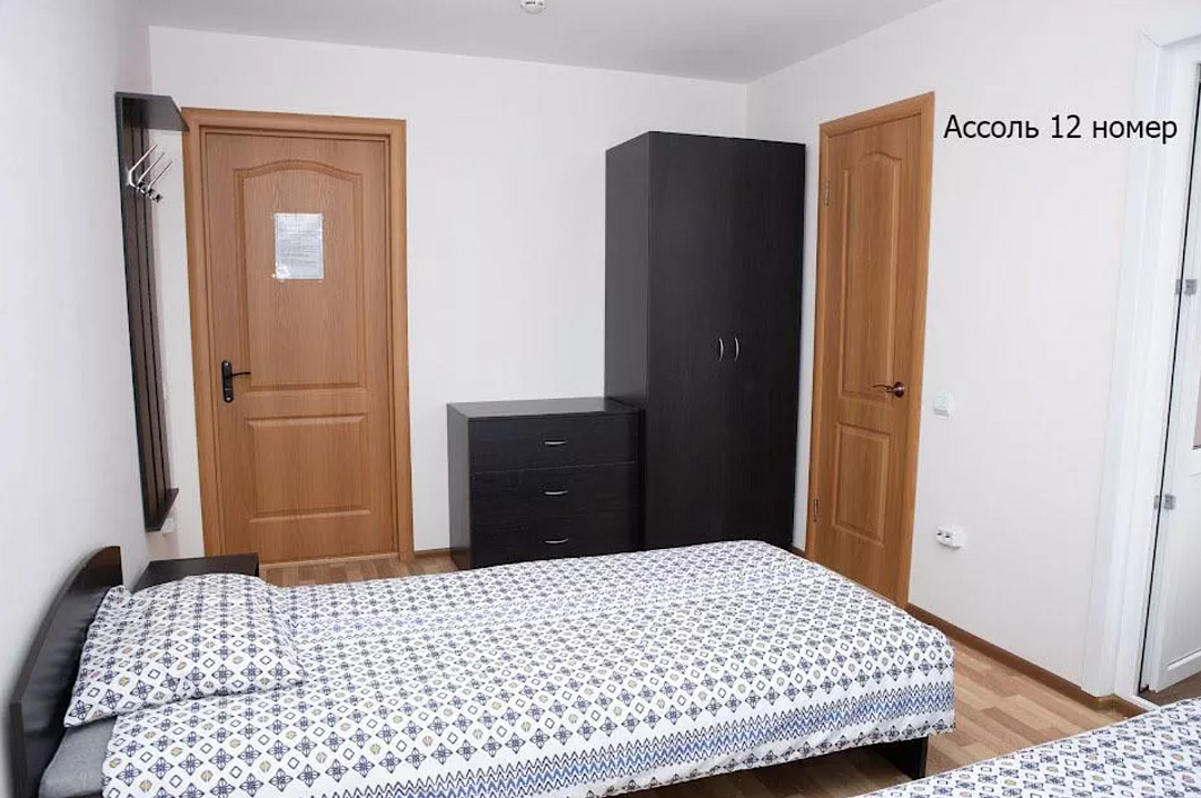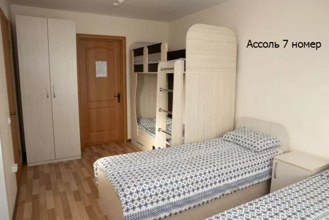 - 2 односпальные кровати (или одна двуспальная), одна двухъярусная кровать, шкаф, 2 тумбочки, 4 комплекта постельного белья, полотенце на каждого и выход на балкон. В каждом номере есть небольшой балкон (индивидуальный или совместный с соседним номером). Сушилка для белья.