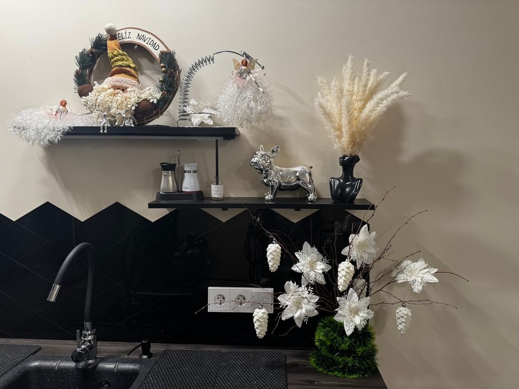 Кухня полностью оборудована всем необходимым: здесь есть холодильник, микроволновая печь, плита, посуда, столовые приборы, кастрюли, сковороды, электрический чайник и гейзерная кофеварка. Дом также располагает запасом продуктов, включая чай, кофе и сахар, а также уютным местом для приема пищи.