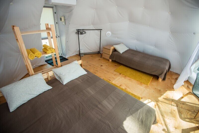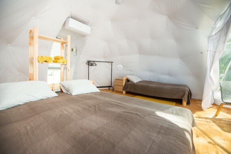 Уютный уединенный номер с панорамным видом из окна. Домик оборудован системой кондиционирования и отопления, подходит для отдыха в любое время года. Установлены три модульные кровати, есть возможность поставить дополнительное спальное место.