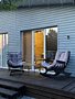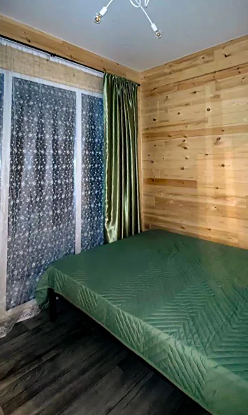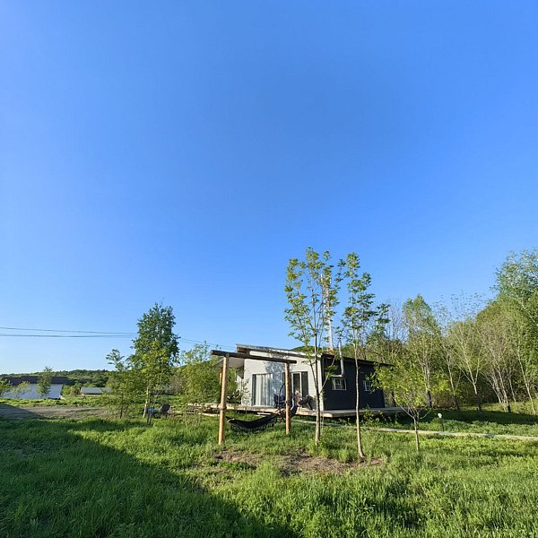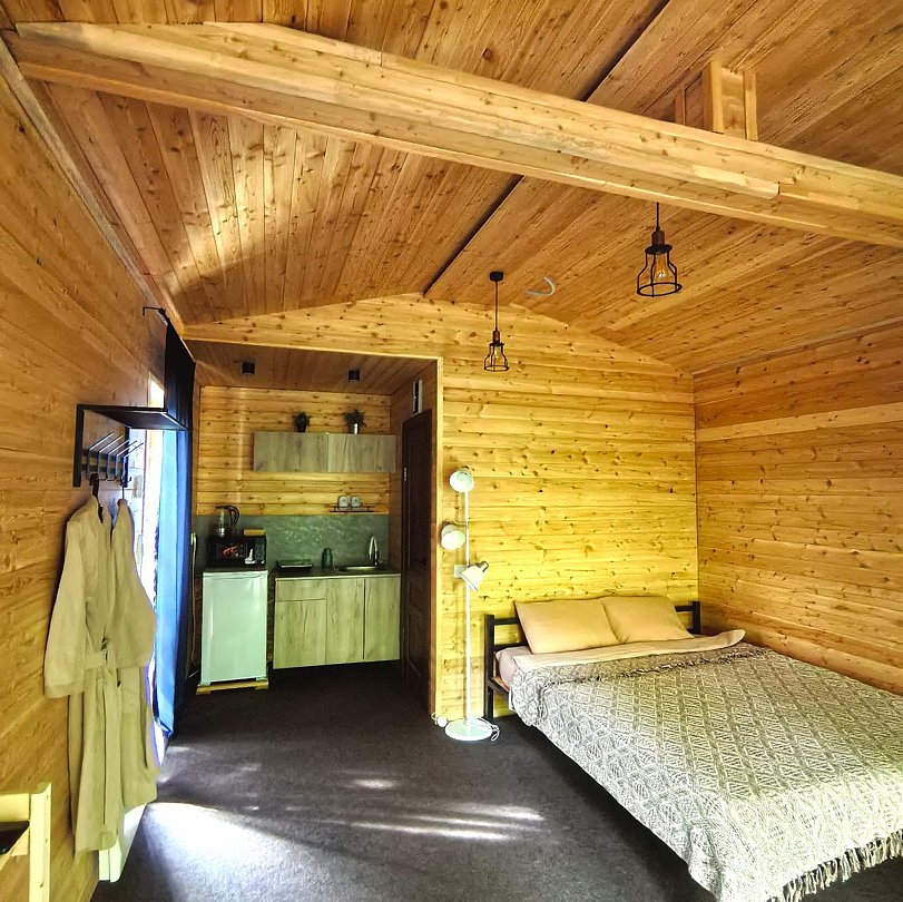 В домике спальня с двуспальной кроватью, санузел с душевой кабиной, кухонная зона. Кухня оборудованна всем необходимым для проживания.