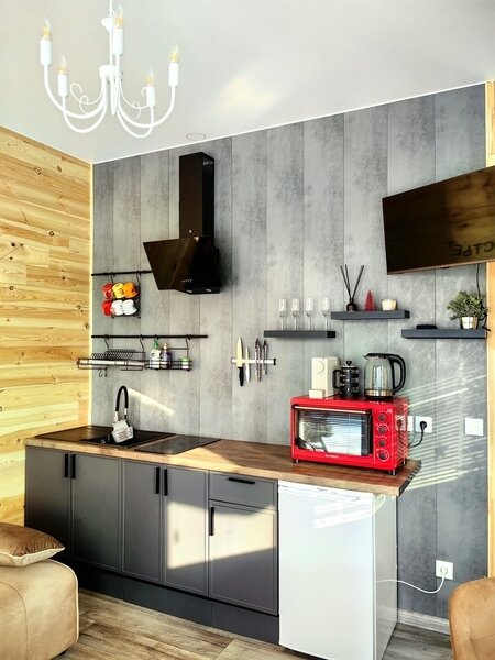 Кухня-гостиная: камин, телевизор с подключенными ОККО, КИНОПОИСК, СМАТРЕШКА, умная колонка Алиса, диван раскладной на два места, холодильник, варочная панель, микроволновая печь, чайник, капсульная кофемашина, капучинатор, посуда, шампуры, решетка для мангала.