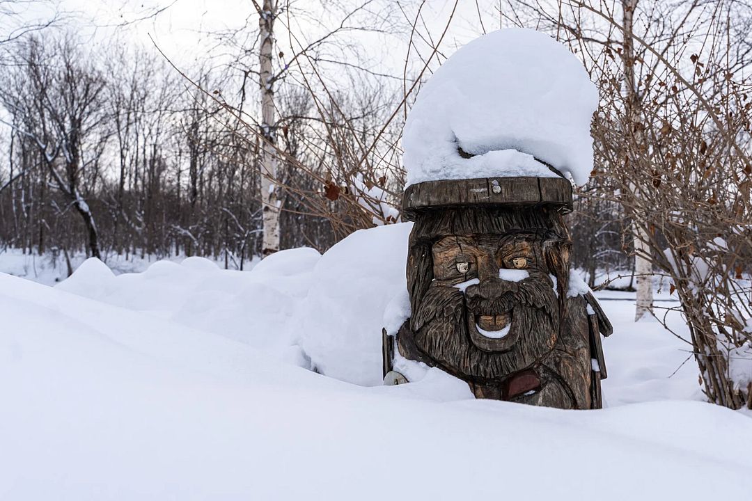 Читать полностьюБеседка сделана из круглого бревна, построена в форме восьмигранника. Со всех сторон стоят окна. Внутри всё сделано из дерева и оформлено нанайскими орнаментами.