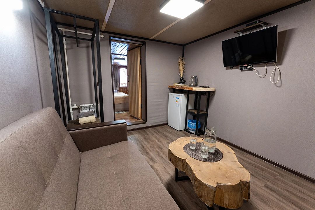 - имеется Wi-Fi, телевизор, холодильник, диван на два спальных места, стол, стеллаж, электрочайник, кондиционер;