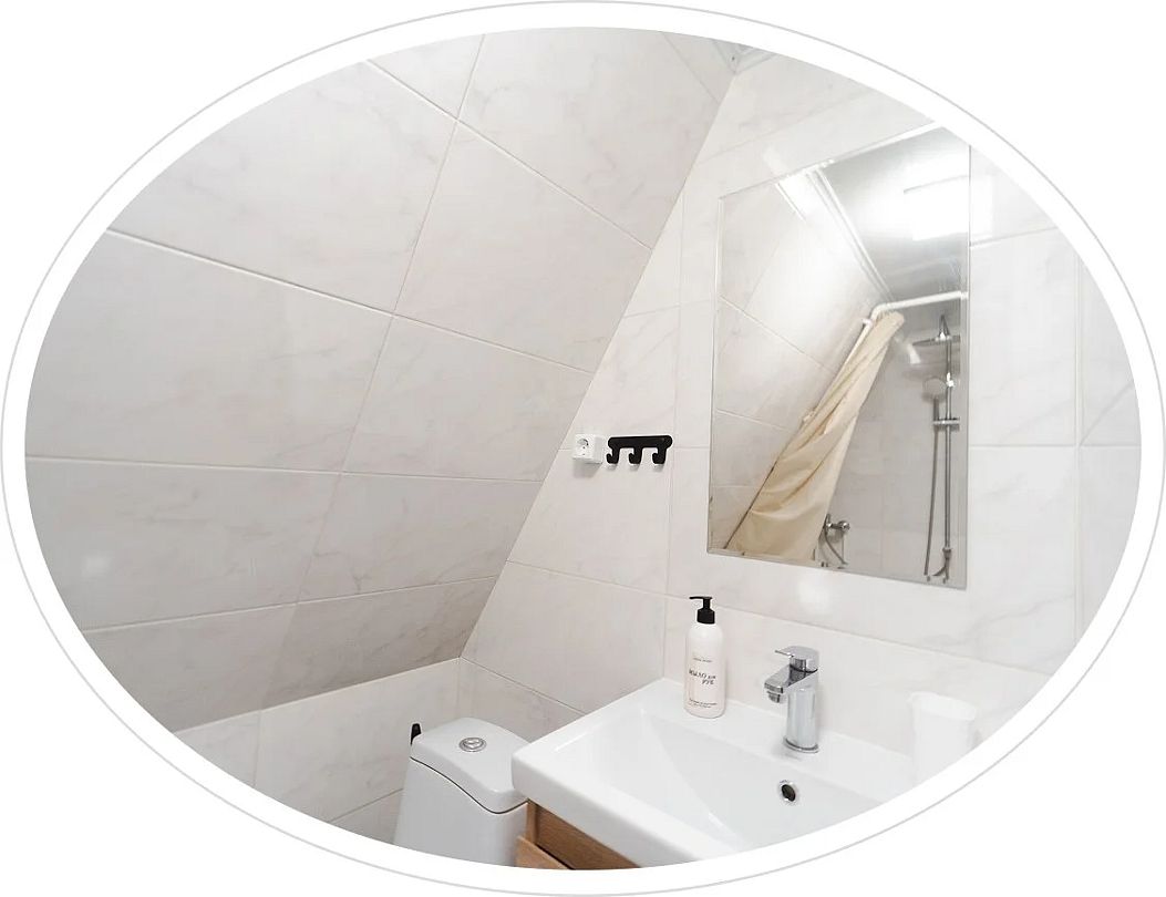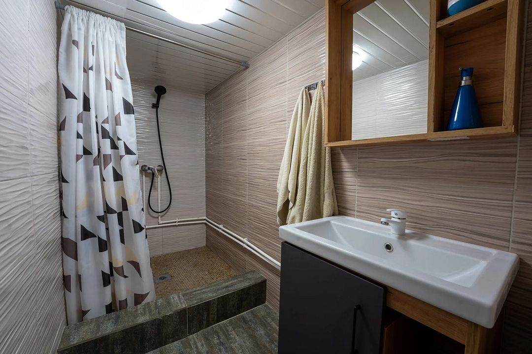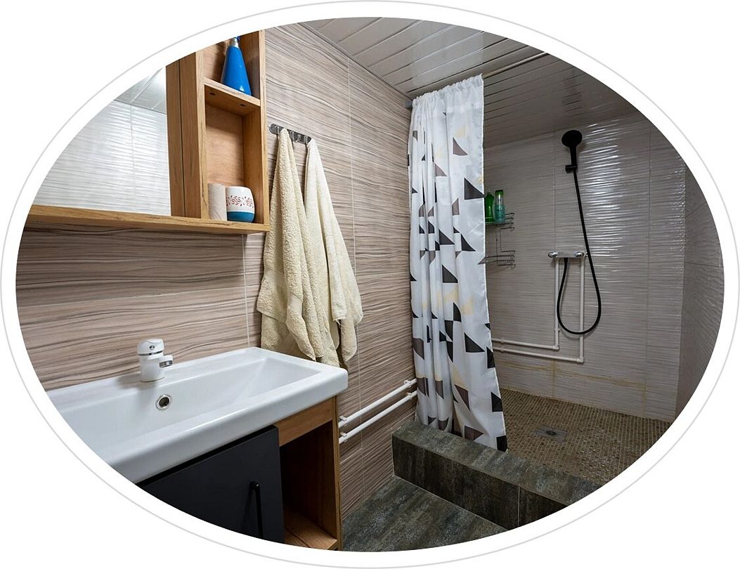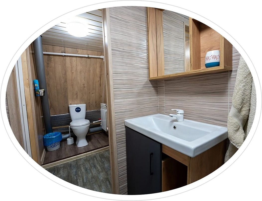 - душевая зона (душ, унитаз, раковина, стаканчик для зубных щеток, мыло для рук, полотенца ручные, банные, фен по запросу у администратора);
