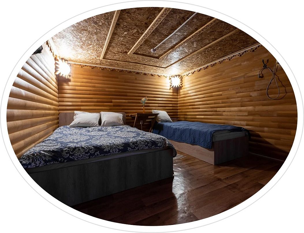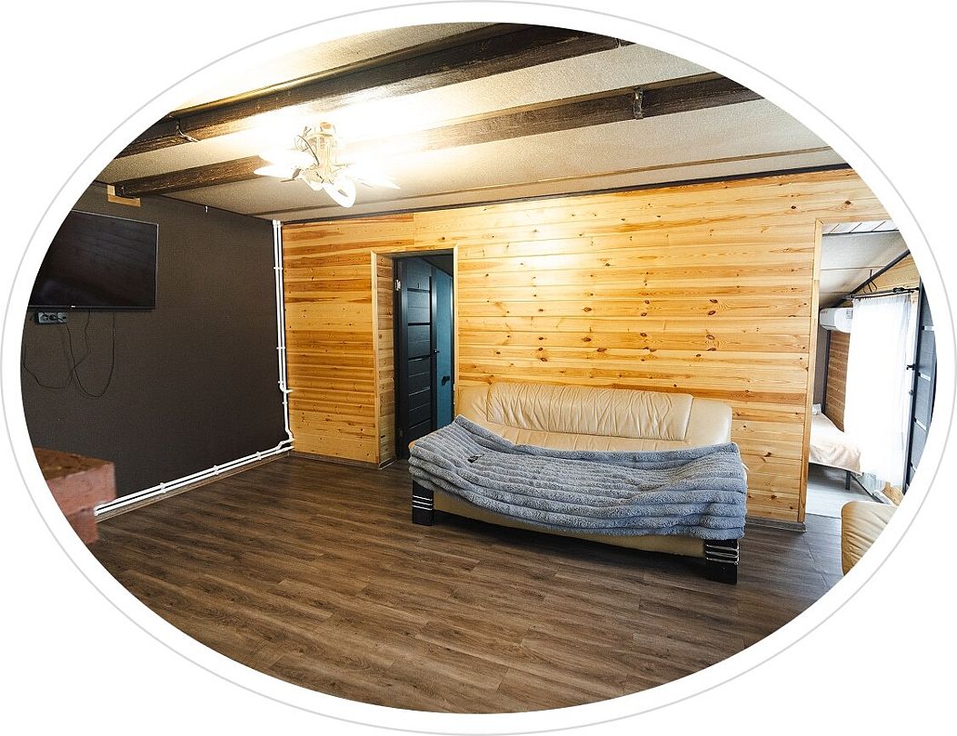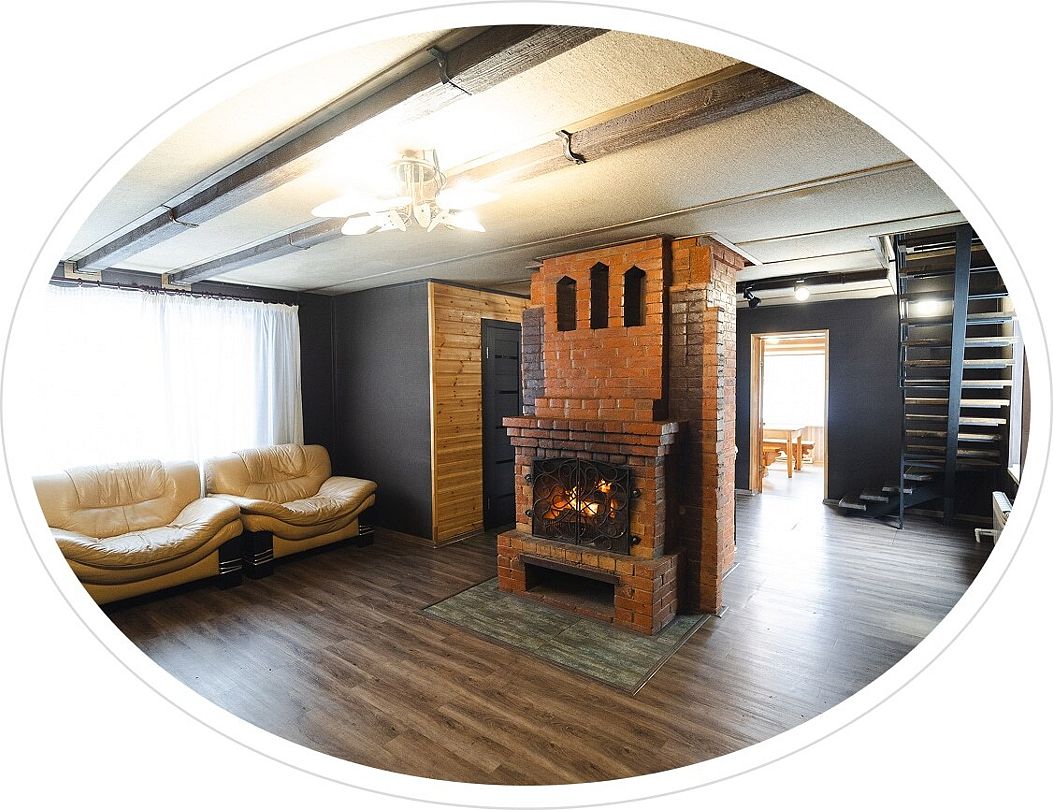 Гостиная — это большой рубленый бревенчатый дом вместимостью до 60 человек. Он сделан из огромных бревен в таёжно-охотничьем стиле, украшен шкурами диких зверей.