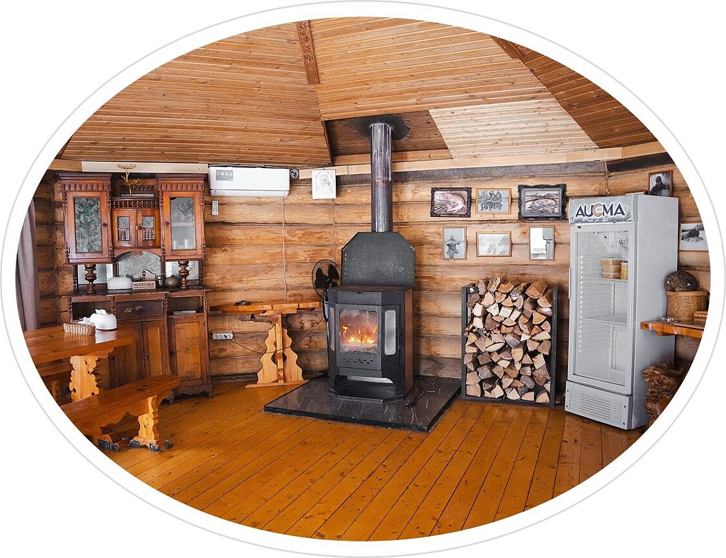 Там стоят кедровые столы из натурального кедра и большая русская печь для приготовления изысканных блюд по старинным рецептам.
