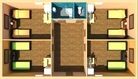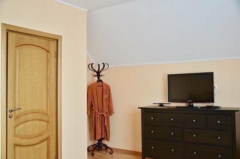 Двухэтажный VIP коттедж на 6 человек.В коттедже: 1 спальня на первом этаже двуспальная кровать; комод; кресло; столик; спутниковое телевидение; кондиционер; отопление), 2 спальни на втором этаже (2 полутораспальные кровати; комод; кресло; столик; спутниковое телевидение; кондиционер; отопление), холл на первом этаже (диван; кресло; столик; кондиционер), столовая зона на первом этаже (кухонный гарнитур; стол + 6 стульев; холодильник; СВЧ печь; чайник; набор посуды), сейф, кладовая комната, душевая комната (душевая кабина; раковина; унитаз), туалетная комната (унитаз; раковина), прихожая (вешалка; тумба под обувь), постельное белье + комплект полотенец, халаты, тапочки, туалетные принадлежности. Максимальное размещение 6 взрослых + 2 ребенка