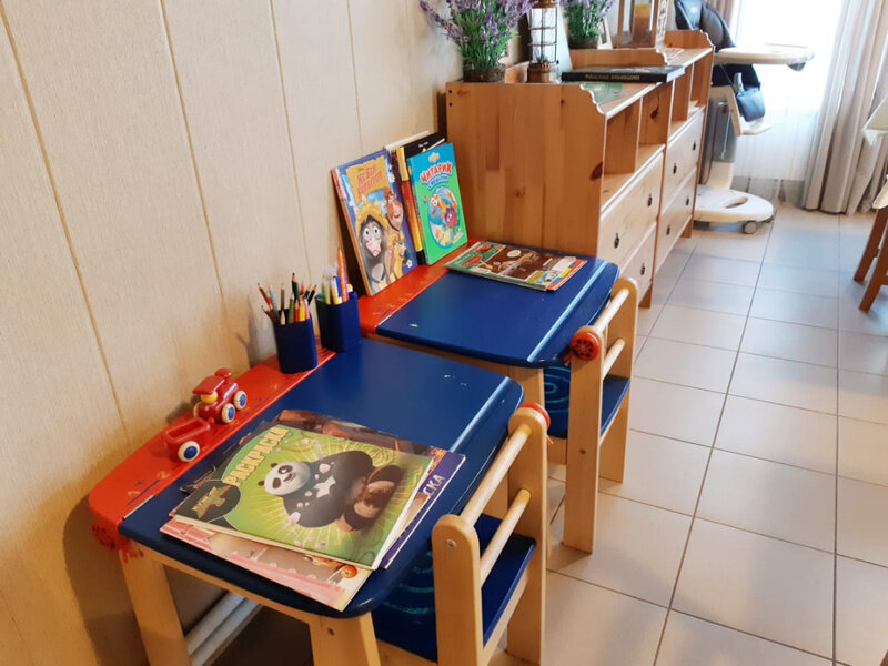 - детская зона в ресторане со стульчиком для кормления, раскрасками, книгами и игрушками;