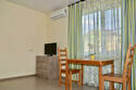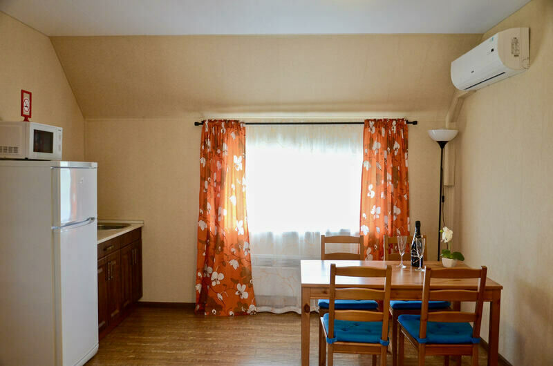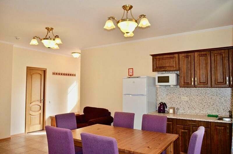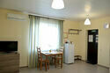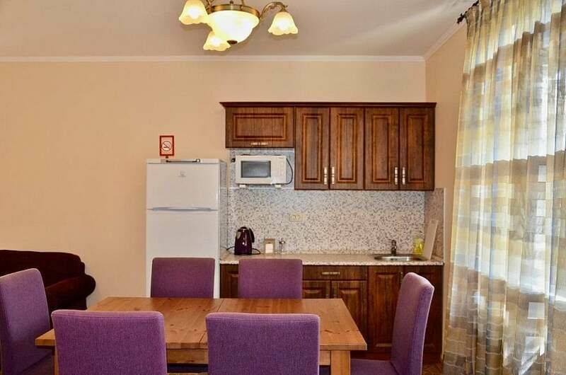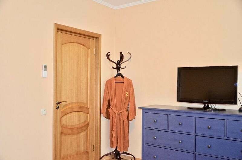 2 номера "Студия" с улучшенной планировкой ( 2 человека + 2 дополнительных места для ребенка). В номере есть: кондиционер, отопление, холодильник, СВЧ печь, чайник + чай, кофе, сахар, комплект посуды, телевизор + спутниковое телевидение, сейф, кухонный гарнитур, стол + 4 стула, двуспальная или две односпальных кровати, комод, 2 кресла - кровати, постельное белье + комплект полотенец, халаты, тапочки, туалетные принадлежности.