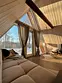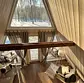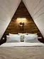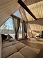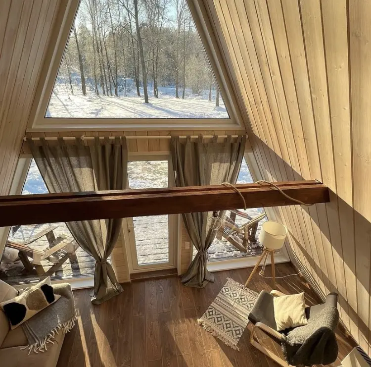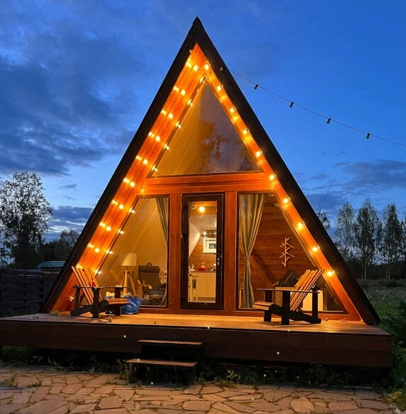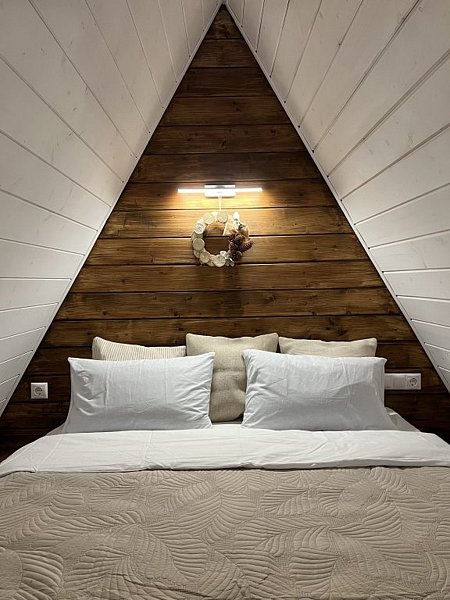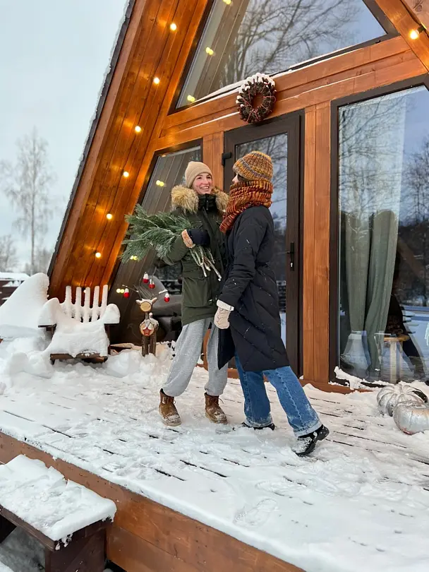 На территории разместились два домика типа А-фрем с панорамным остеклением, каждый из которых полностью оборудован для комфортного проживания в любое время года. Есть спальня, санузел с душем и кухня со всем необходимым для приготовления еды.