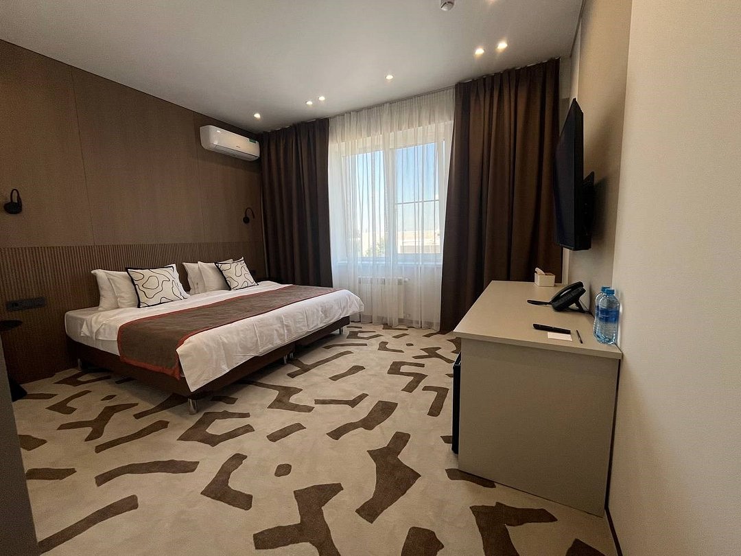 Wi-Fi, телефон, кондиционер, фен, будильник, электронные замки, душевая кабина, санузел, халаты, тапочки, гигиенические средства, косметические средства, две односпальные или большая двуспальная кровать, унитаз, раковина, вид на город, вид во двор, вид на стадион, туалетные средства, туалет, цифровое тв, телевизор с плоским экраном, мини-холодильник, телевизор со Smart TV, шапочка для душа, мыло, дождевой и ручной душВ номере