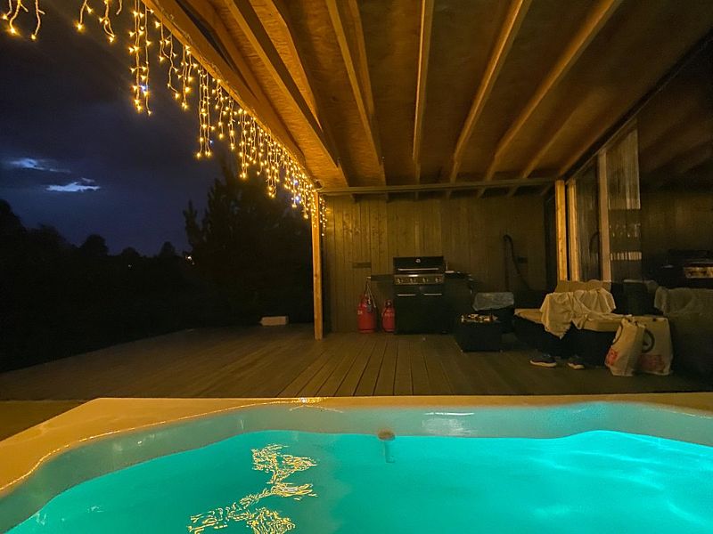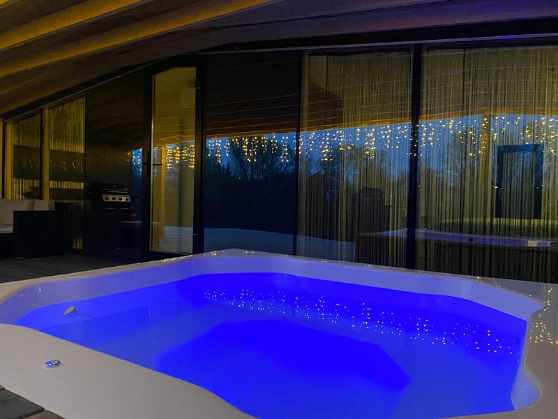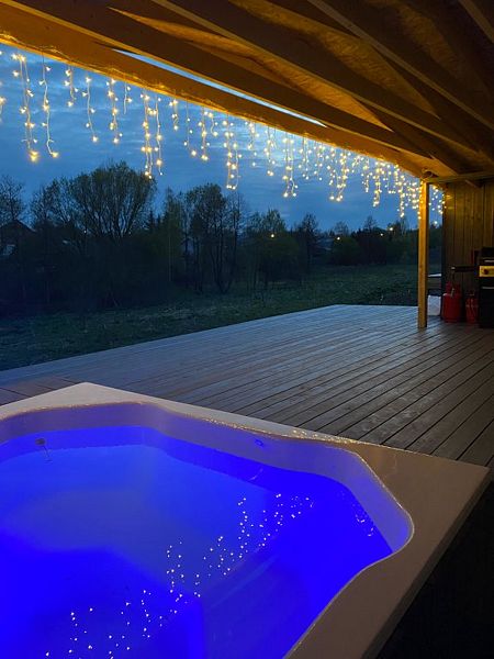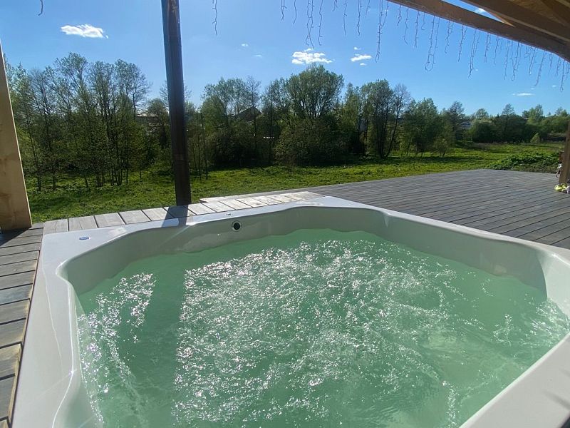 Гостей ждет уютное джакузи с горячей водой прямо на веранде — идеальное место, чтобы насладиться отдыхом на свежем воздухе. А для создания особой атмосферы предлагается просмотр любимых фильмов прямо в джакузи!