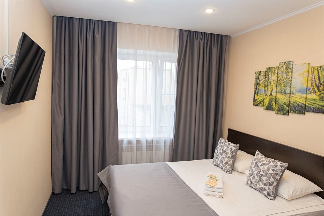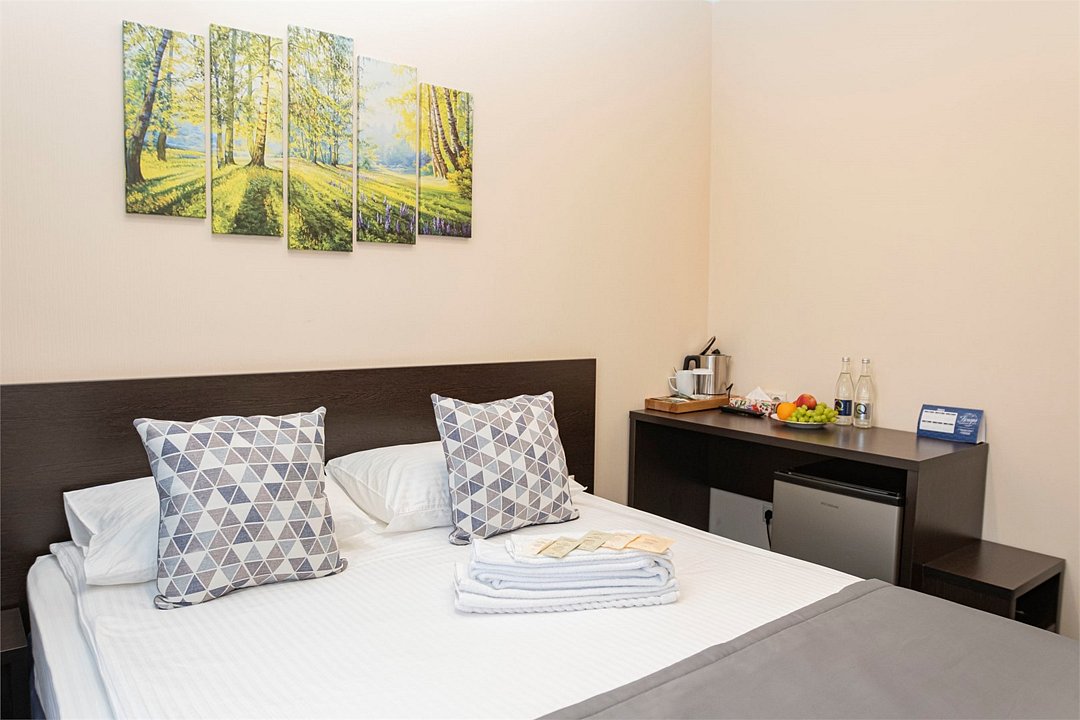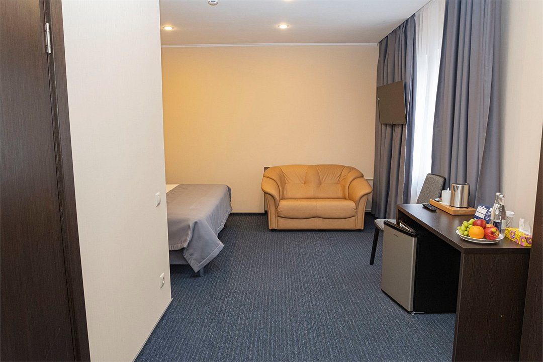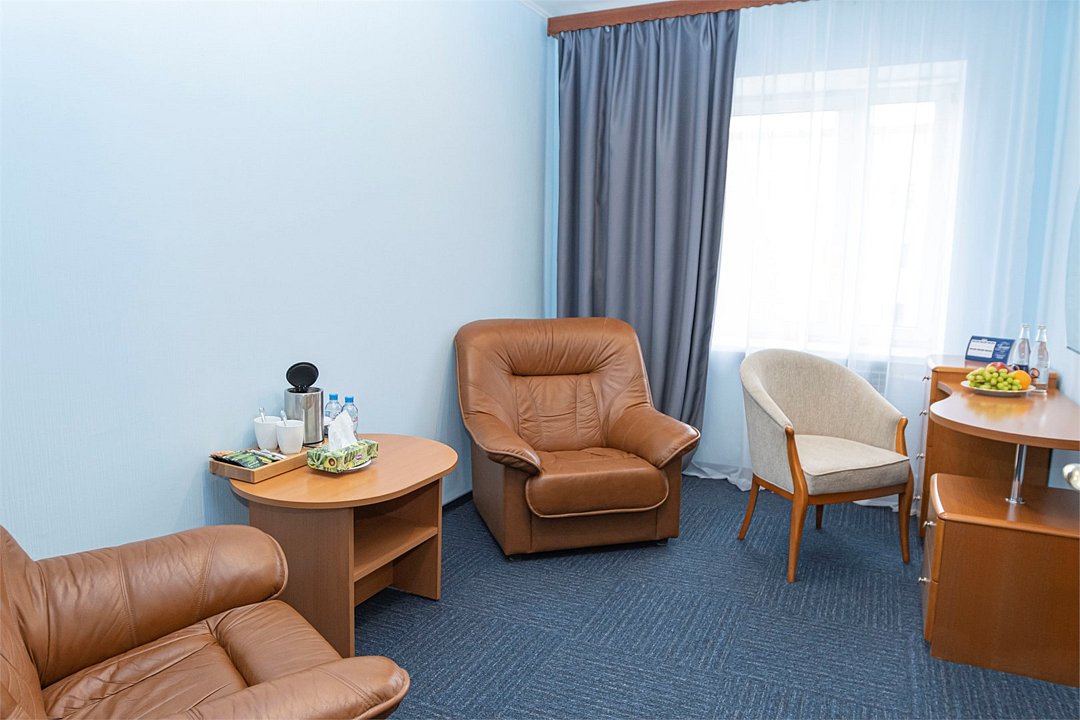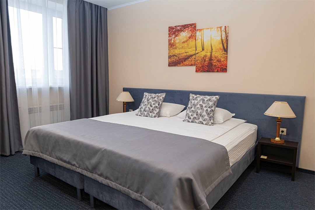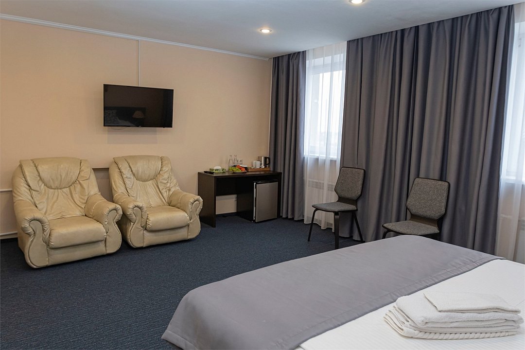 Двухкомнатный номер, двуспальная кровать 160*200, мягкая мебель, телевизор, холодильник, чайник, фен, посуда, ванная комната, халат, тапочки. Площадь 28 кв.м. Завтрак включен.Услуги и удобства