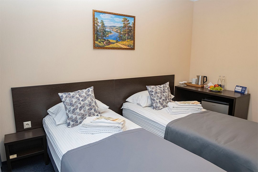 Две односпальных кровати 80*200, телевизор, холодильник, чайник, фен, посуда, душ. Площадь 16 кв.м. Завтрак включен.Услуги и удобства