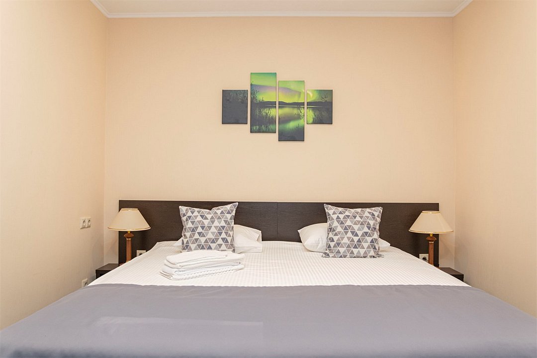 Двуспальная кровать 200*200, диван, телевизор, холодильник, журнальный столик, чайник, фен, посуда, халат, тапочки, ванная комната. Площадь 21 кв.м. Завтрак включен.Услуги и удобства