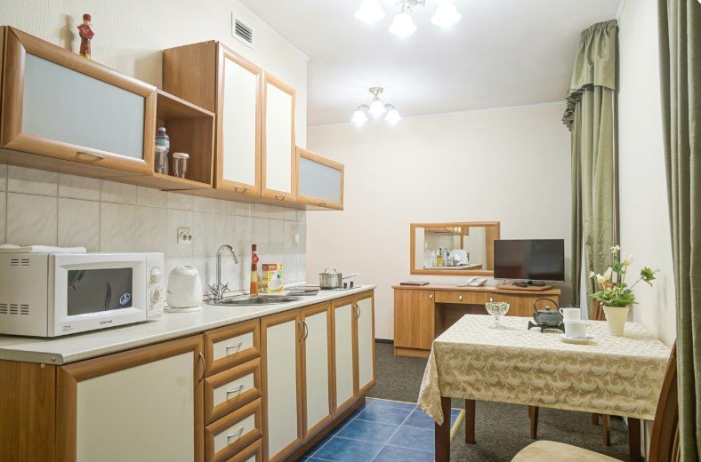 Площадь номера: 38 м². Номер повышенной комфортности -полутороспальная кровать -телевизор -ванная комната -кухонный уголок -чайный набор -холодильник -Wi-Fi -платный мини-бар -фумигатор,чайник (по требованию)Услуги и удобства
