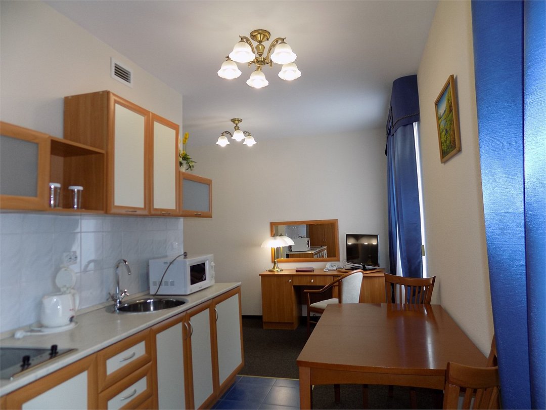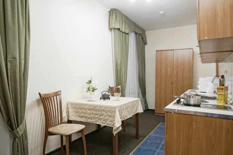Площадь номера: 26 м². Номер повышенной комфортности -полутороспальная кровать -телевизор -ванная комната -кухонный уголок -чайный набор -холодильник -Wi-Fi -платный мини-бар -фумигатор,чайник (по требованию)Услуги и удобства