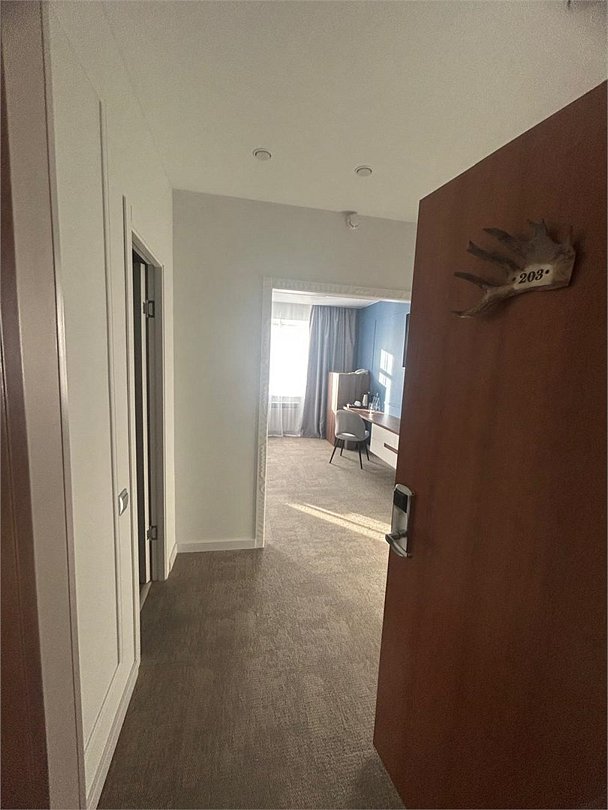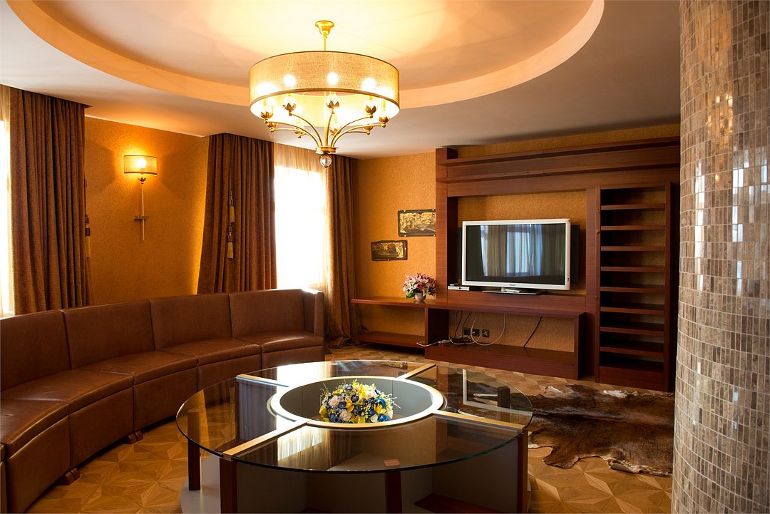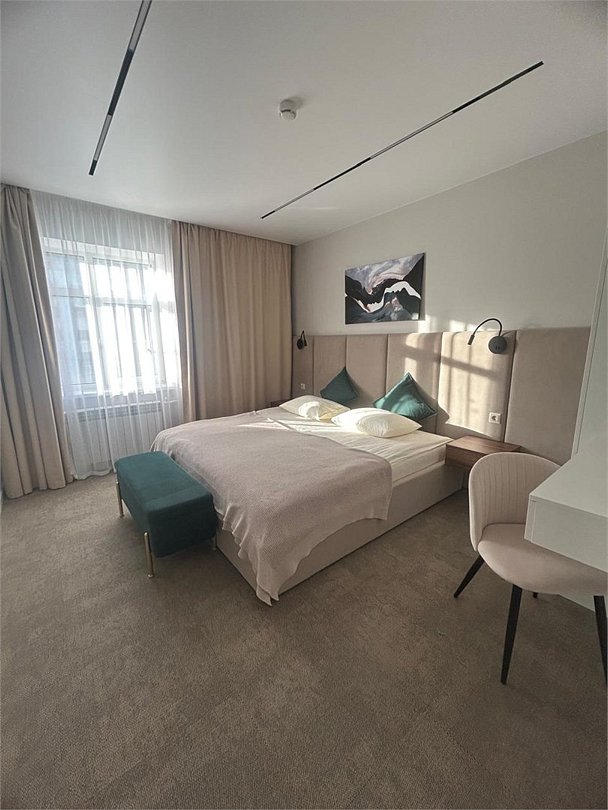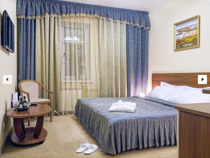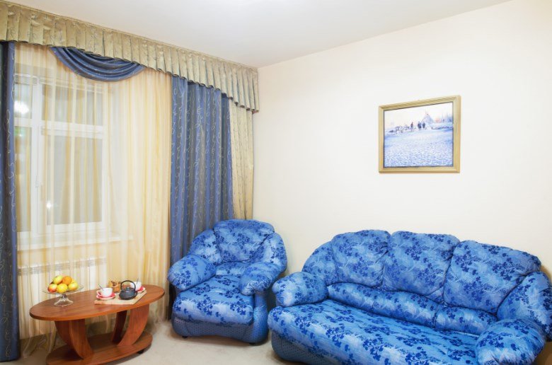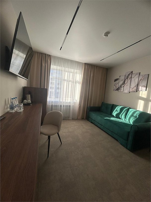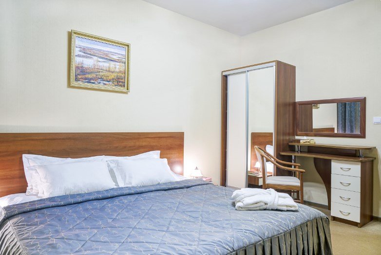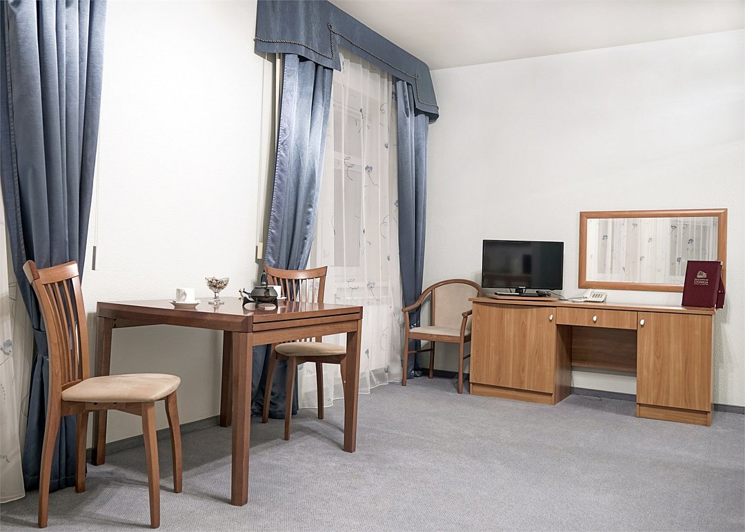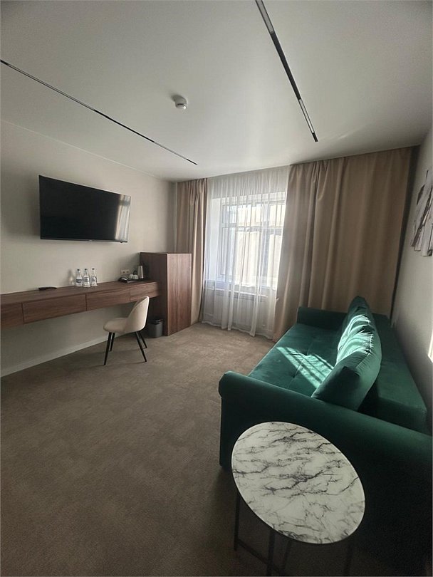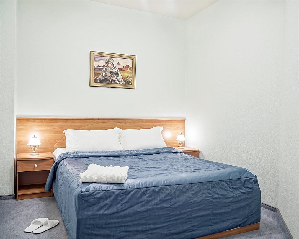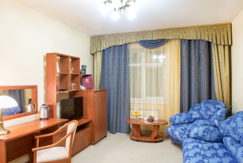 Площадь номера: 42 м². Двухкомнатный номер повышенной комфортности -двуспальная кровать -телевизор в каждой комнате -ванная комната -мягкая мебель -сейф -чайный набор -холодильник -Wi-Fi -платный мини-бар -фумигатор,чайник (по требованию)Услуги и удобства