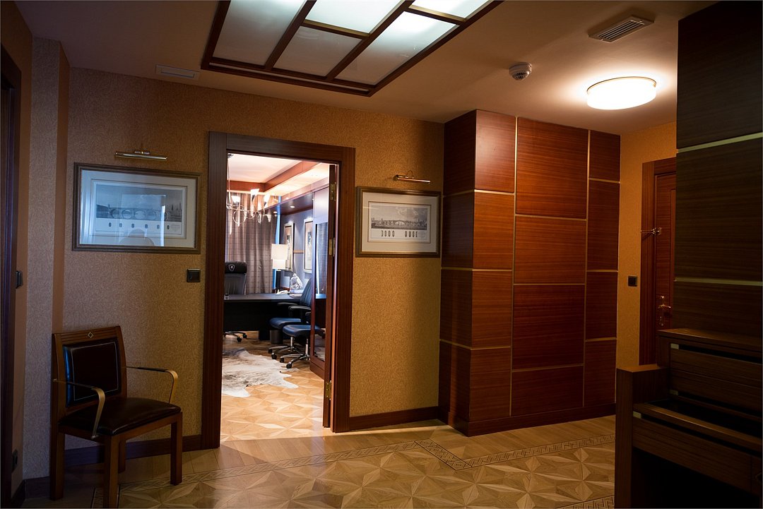 Площадь номера: 108 м². Трёхкомнатный люкс повышенной комфортности -великолепная спальня -просторная гостиная с элегантной итальянской мебелью -современный рабочий кабинет -сейф -две ванных комнаты -барный уголок -чайный и винный набор -Wi-Fi -комплимент от гостиницы при заездеУслуги и удобства