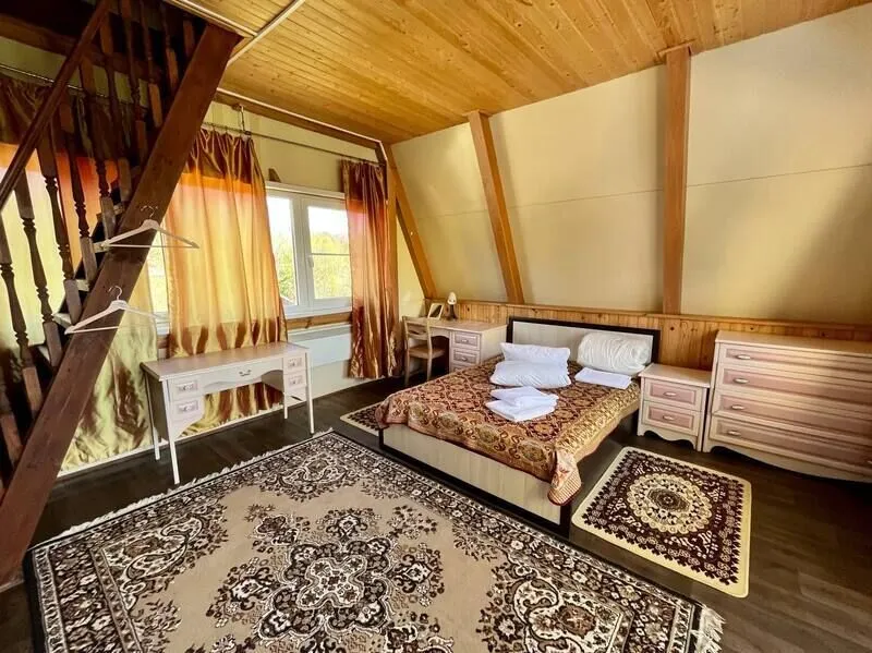 Внутреннее пространство дома занимает три этажа. На первых двух этажах располагаются два просторных спальных помещения с двуспальными кроватями, а на мансардном этаже есть дополнительное спальное место. Также в доме есть большой светлый зал и полностью оборудованная кухня, обеспечивающие комфортные условия для проживания. Завершает картину уютная ванная комната.
