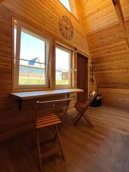 Внутреннее пространство дома включает в себя спальню с двуспальной кроватью, а также гостиную зону с раскладным диваном-кушеткой. Кроме того, здесь есть полностью оборудованная кухня и собственная ванная комната, что обеспечивает максимальную самостоятельность и независимость отдыхающих.