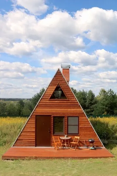 Для уютного и комфортного отдыха на природе предлагается стильный двухэтажный домик в архитектурном стиле А-фрейм. Главной изюминкой этого шале является наличие уютной кирпичной печи, а также обустроенной зоны для барбекю.