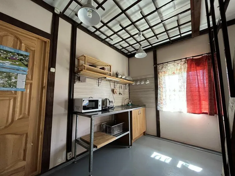 Планировка дома включает в себя четыре просторные спальные комнаты, каждая из которых оборудована удобными двуспальными кроватями. Кроме того, в коттедже имеется мини-кухня, где можно самостоятельно готовить блюда.