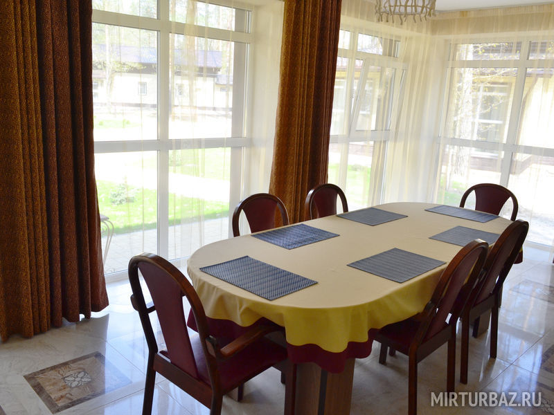 В коттеджах спальня с двуспальной кроватью и гостинная с раскладывающимся двуспальным диваном, телевизором, спутниковым тв; оборудованная мини кухня (холодильник, микроволновая печь, электрический чайник, набор необходимой посуды); ванная комната: душевая кабина, комплект полотенец, банные халаты, постельное белье на всех гостей; зимняя веранда с большим обеденным столом и стульями.