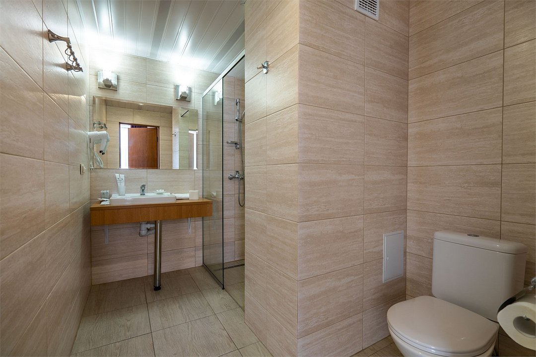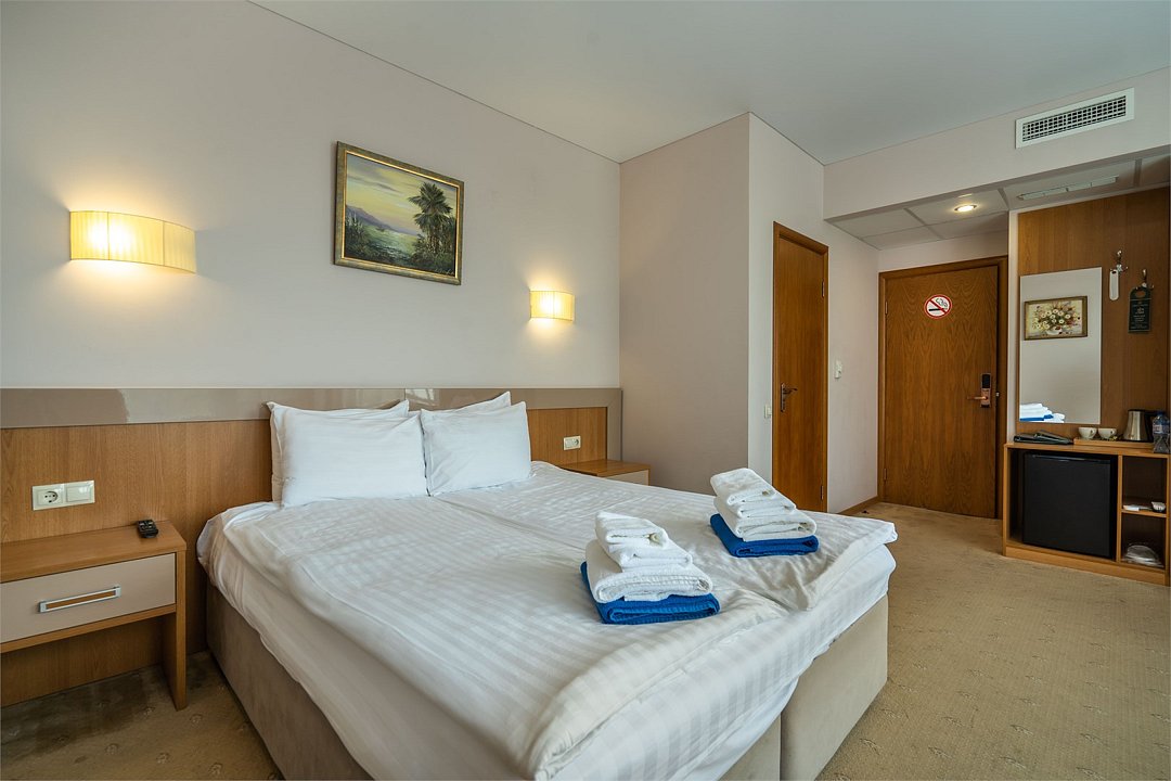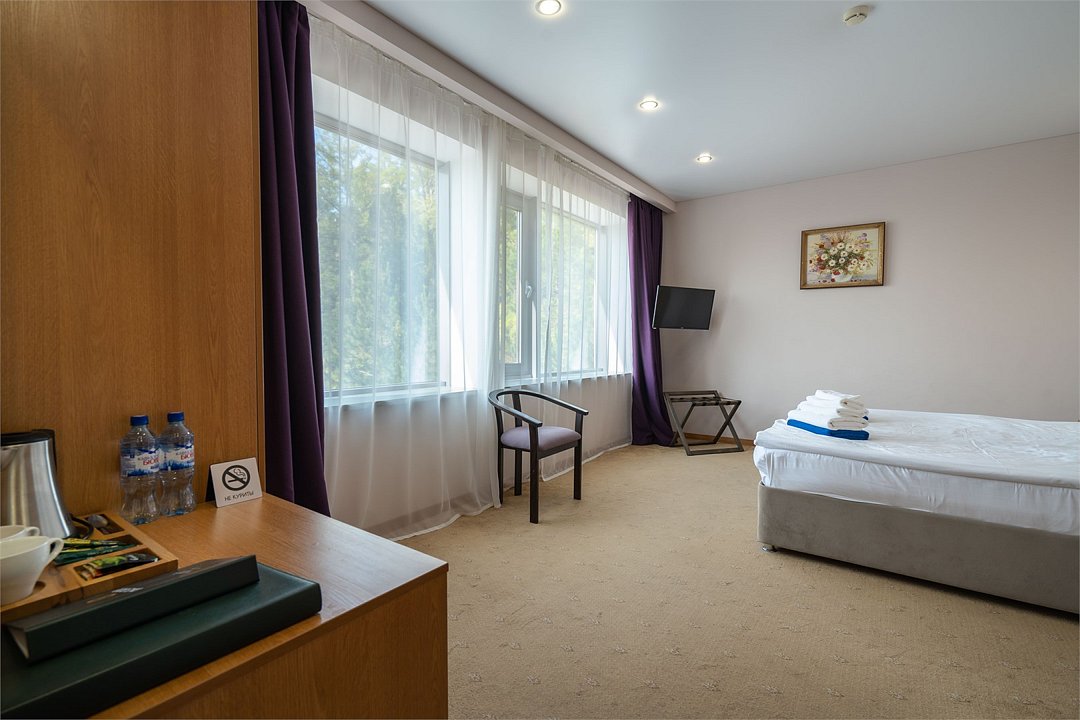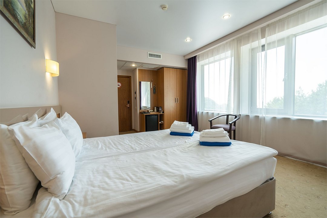 Светлый номер с одной общей или двумя раздельными кроватями. В номере есть телевизор, мини - холодильник. В санузле имеется душ, фен, набор полотенец. Номер без балкона.Услуги и удобства