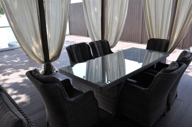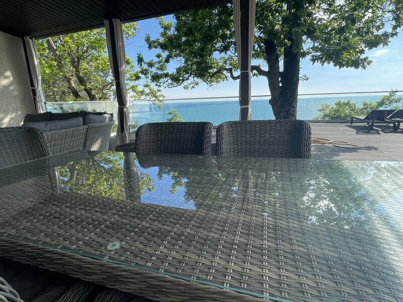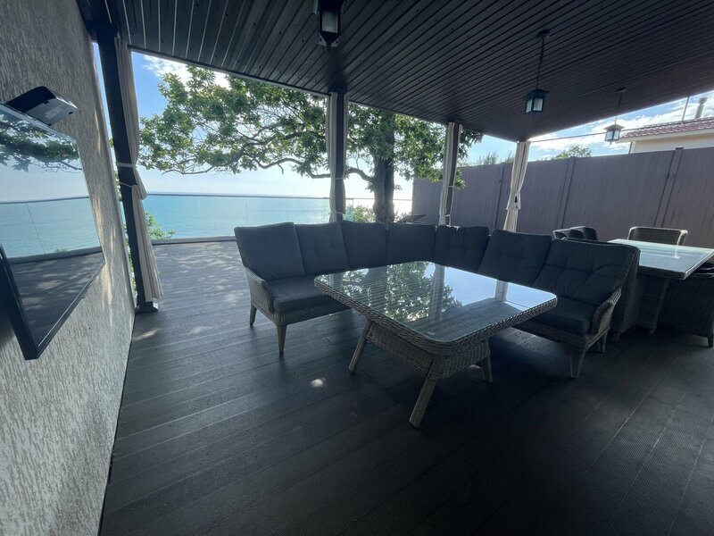 Территория коттеджа спроектирована в европейском стиле, включает в себя зону для барбекю и открытую веранду с видом на море.