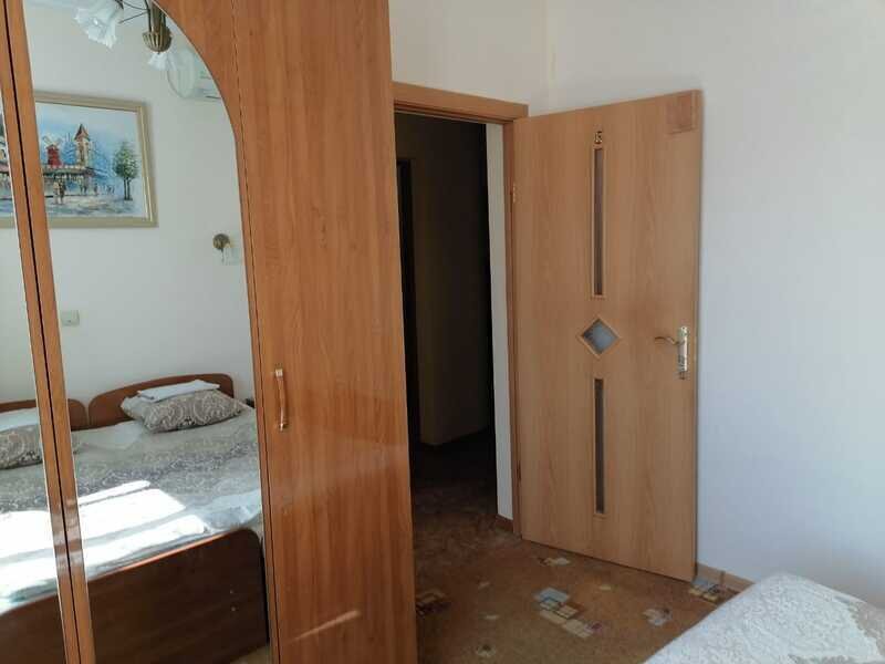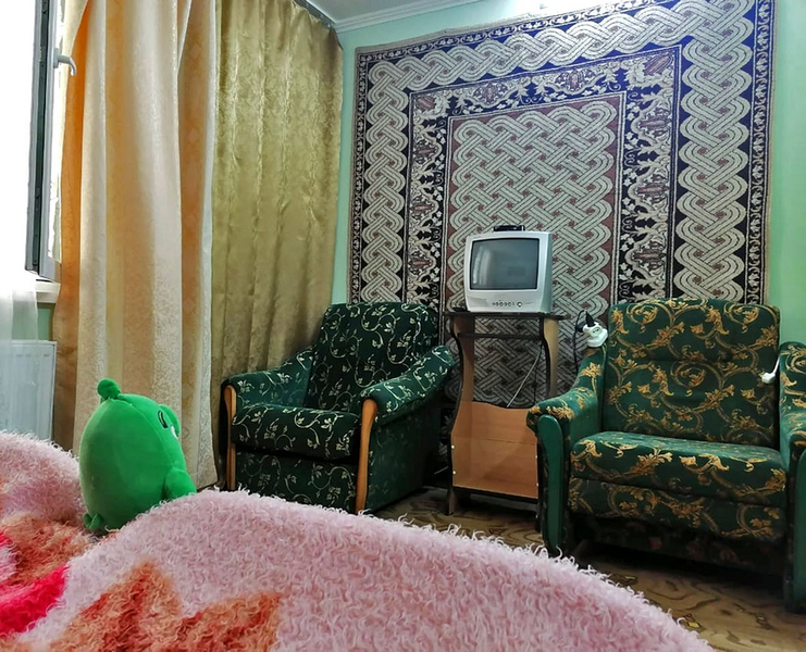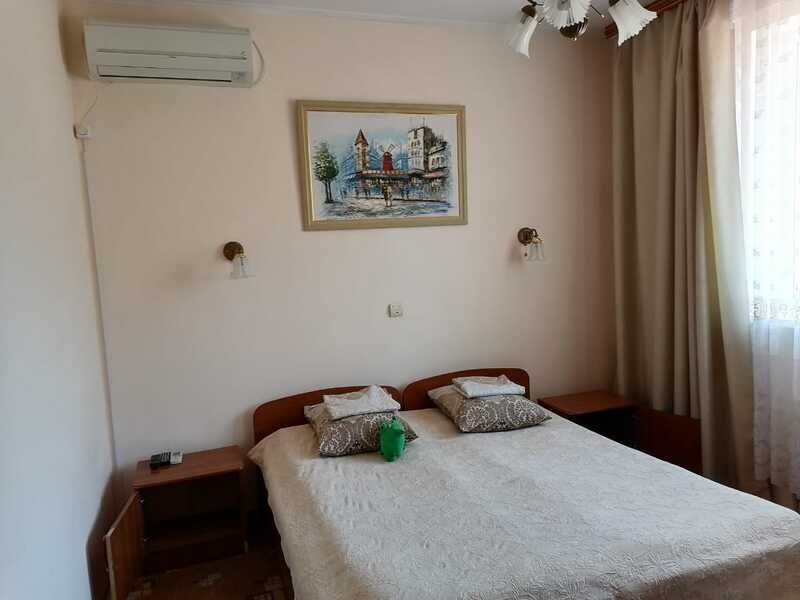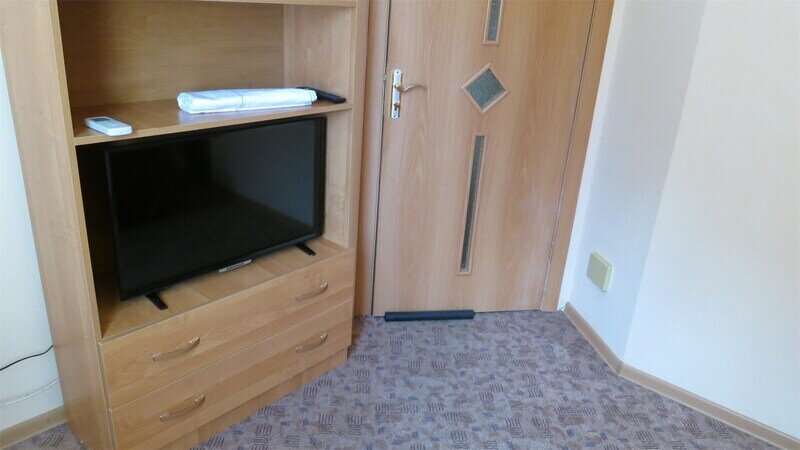 Жилая комната оборудована всем необходимым для проживания: двуспальная кровать, 2 кресла-кровати, прикроватные тумбочки, телевизор, кондиционер, санузел на этаже, душ в номере, интернет. Имеется шкаф для одежды и обуви. Расположен на первом этаже.