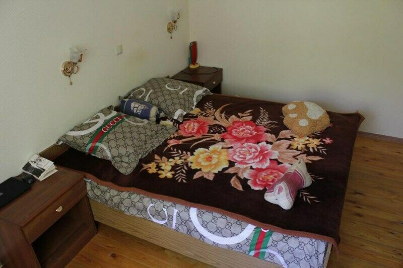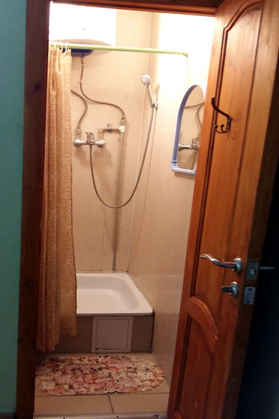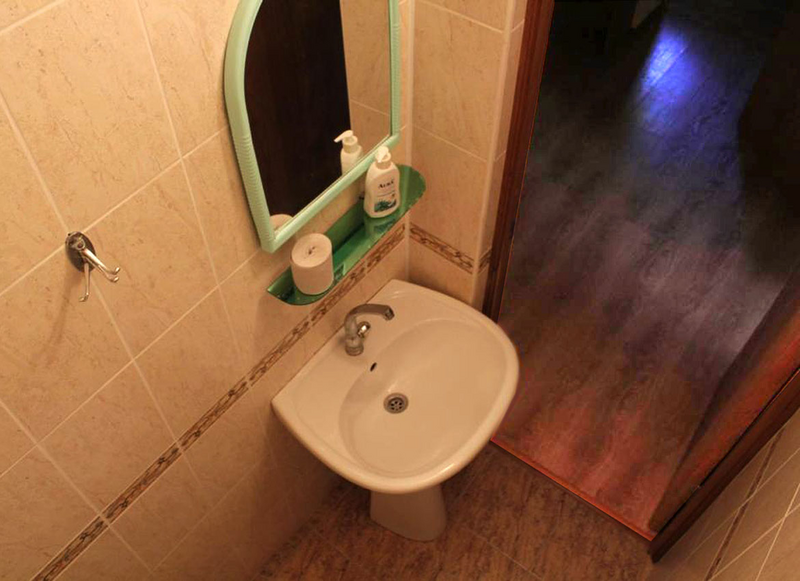 Жилая комната оборудована всем необходимым для проживания: двуспальная кровать, прикроватные тумбочки, телевизор, кондиционер, интернет, холодильник. Имеется шкаф для одежды. Санузел с душевой кабиной на этаже. На этаже три номера.