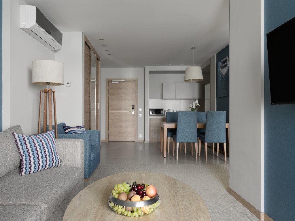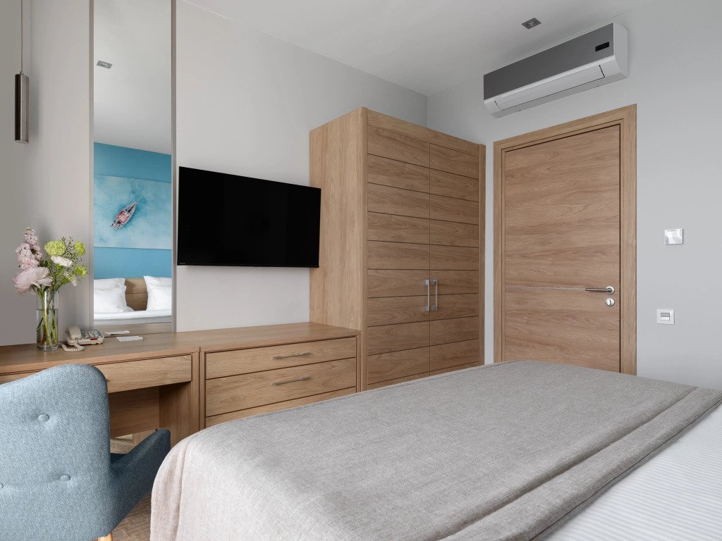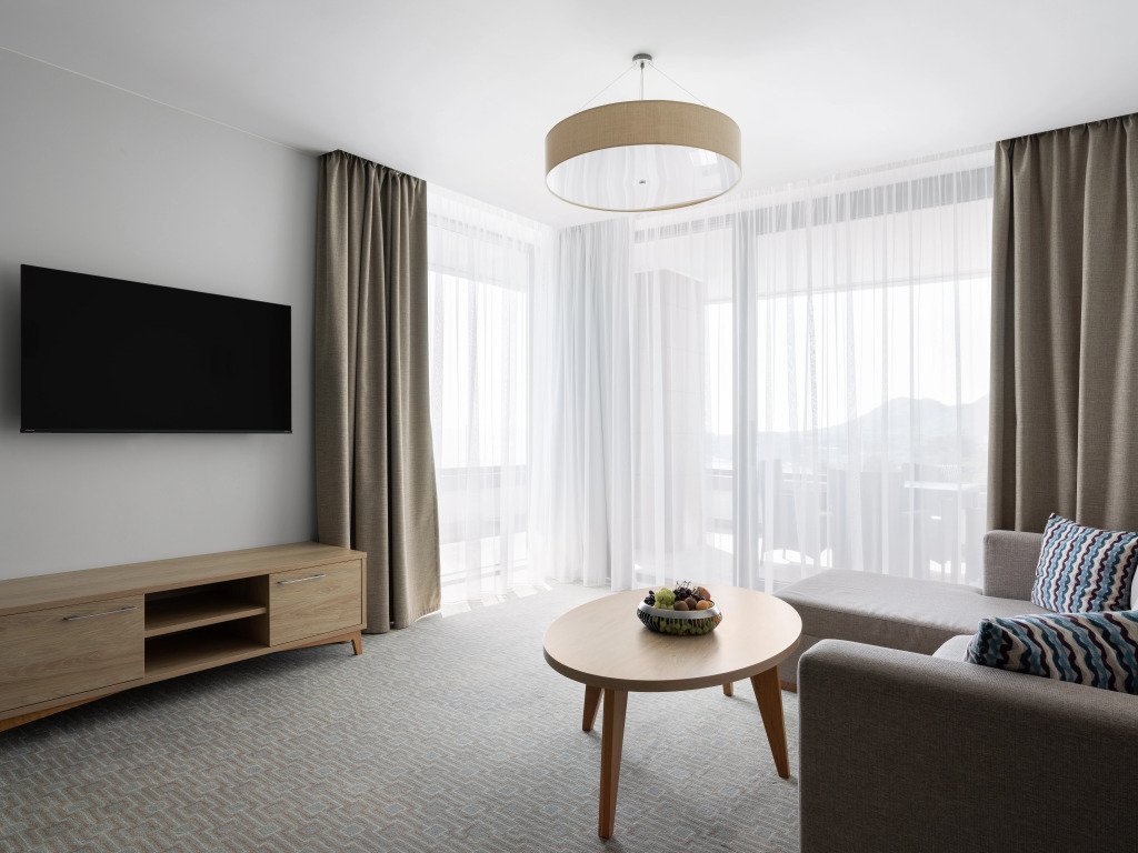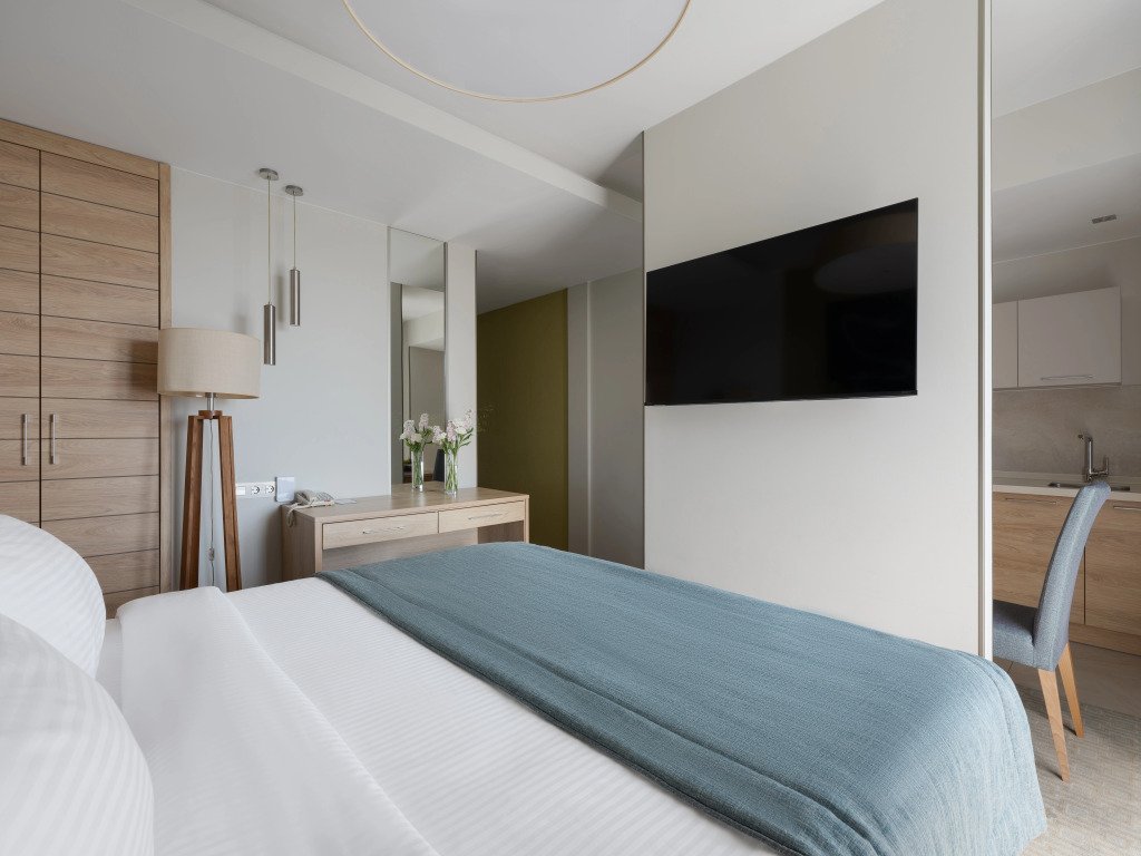 Номер уютно обставлен и оснащён необходимым, чтобы отдохнуть после долгого и насыщенного дня. Имеются телевизор. Оснащение зависит от выбранной категории номера.