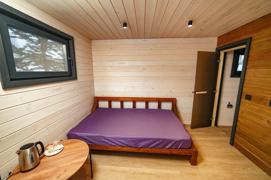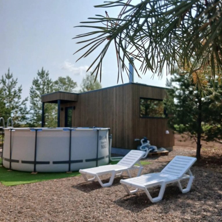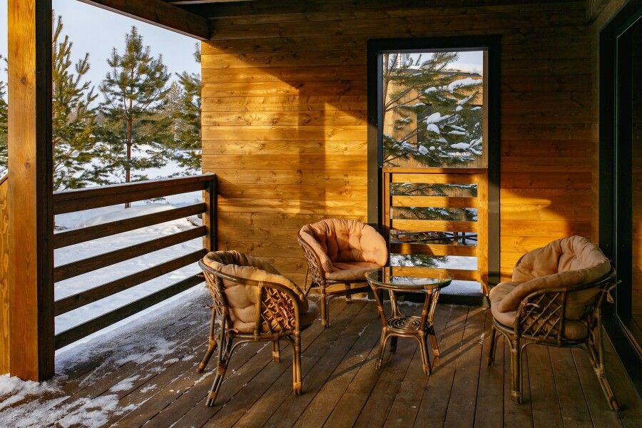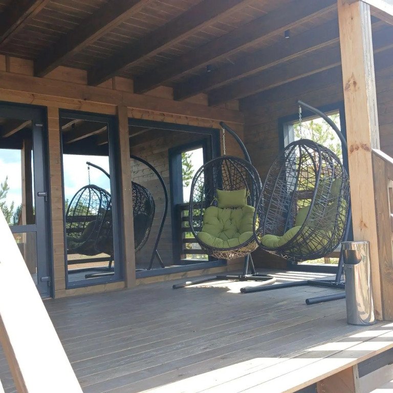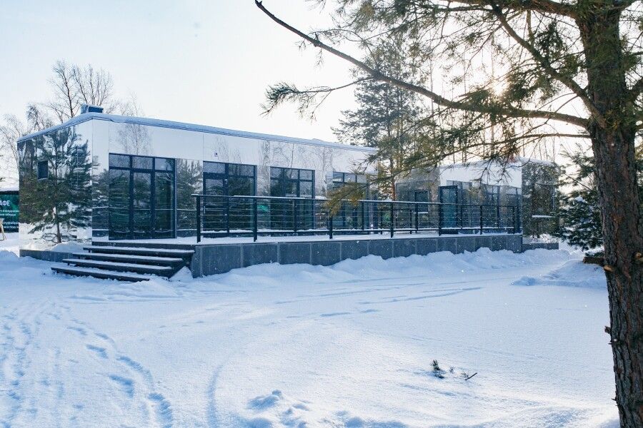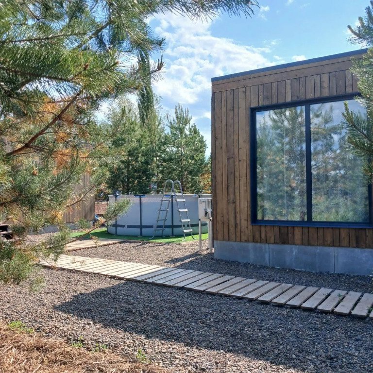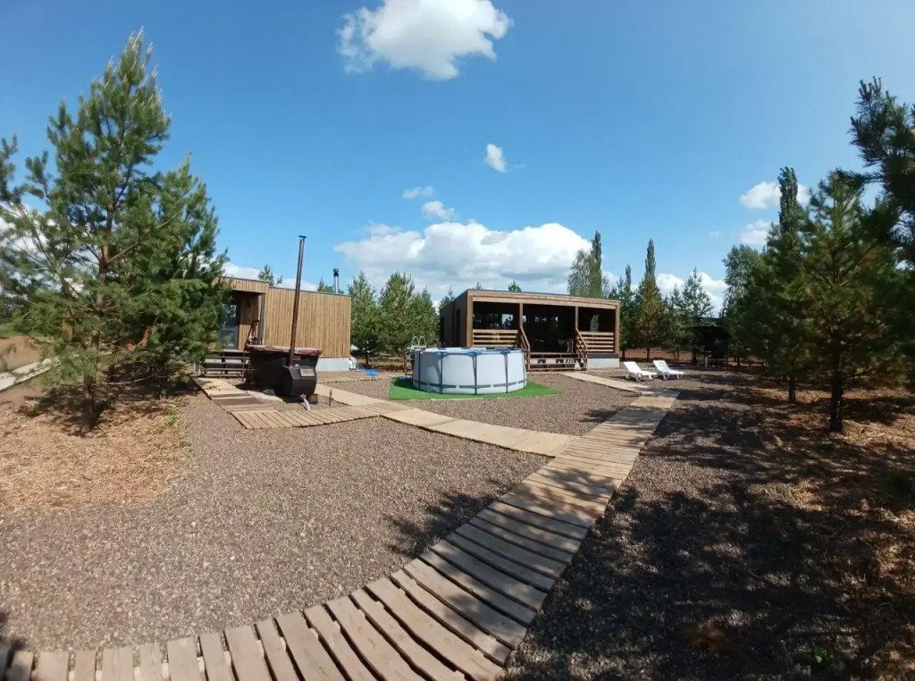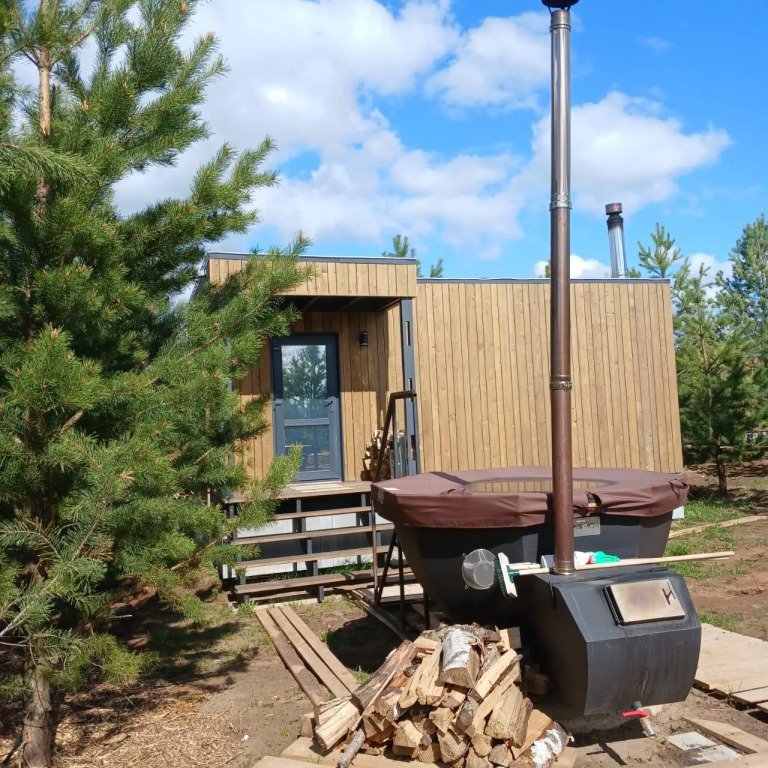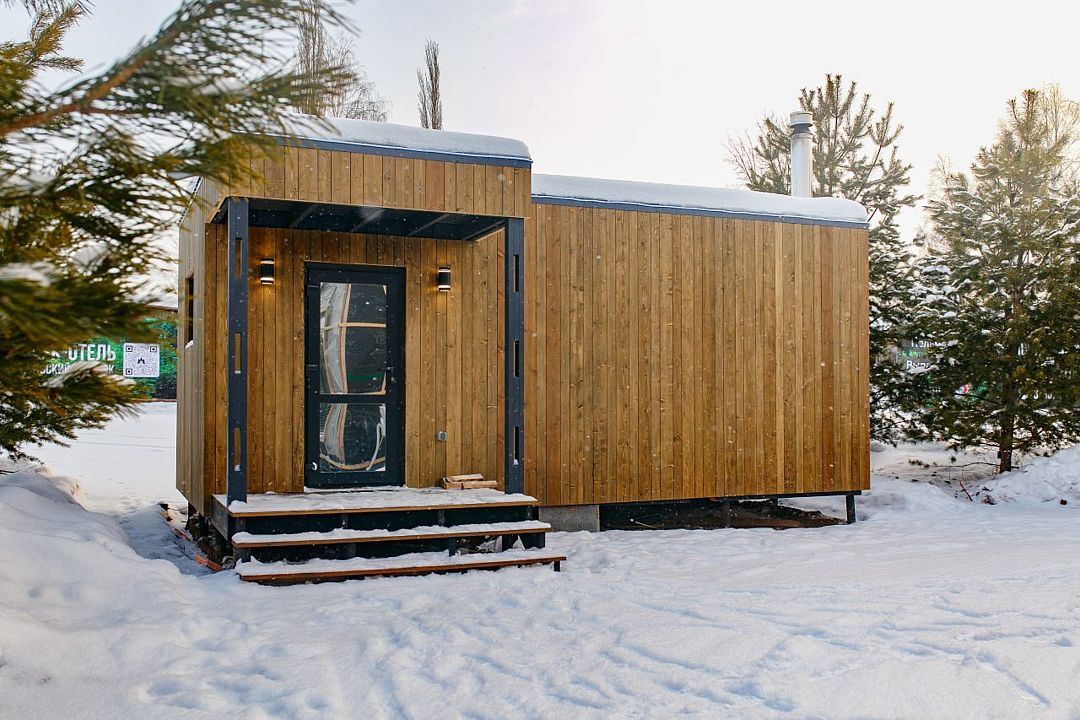 Панорамные окна, занимающие большую часть стен, открывают сказочный обзор на окружающий ландшафт, молодые сосны, а рядом с каждым домиком есть отдельная терраса с местом для отдыха, мангальной зоной и сибирским чаном.
