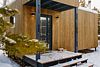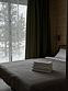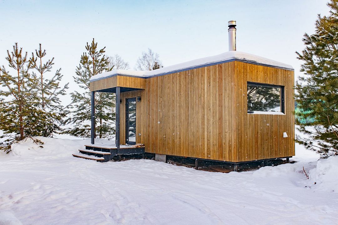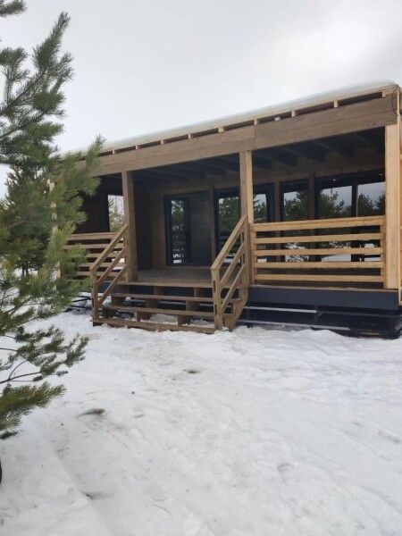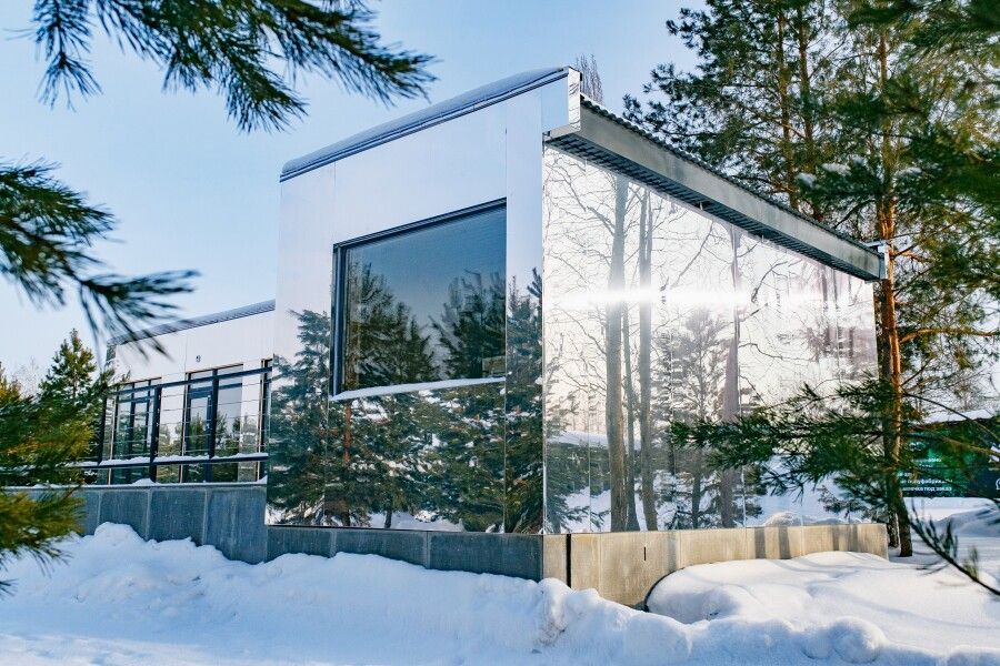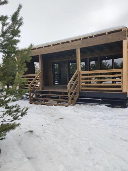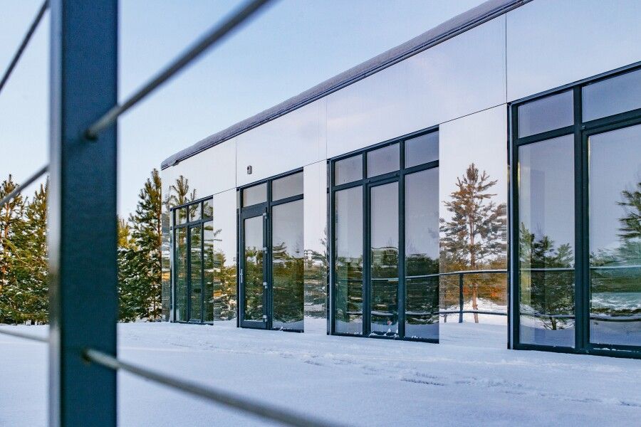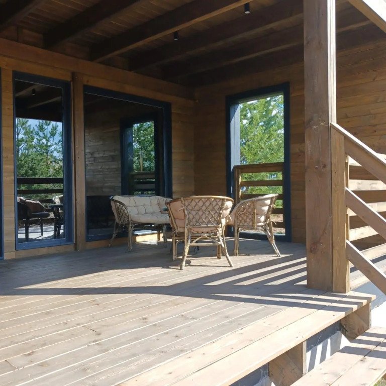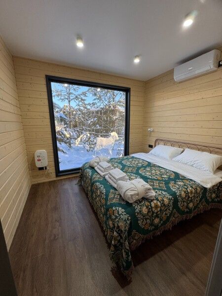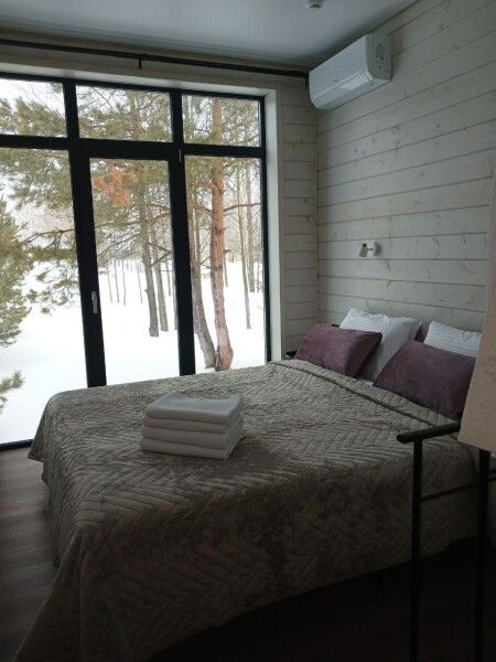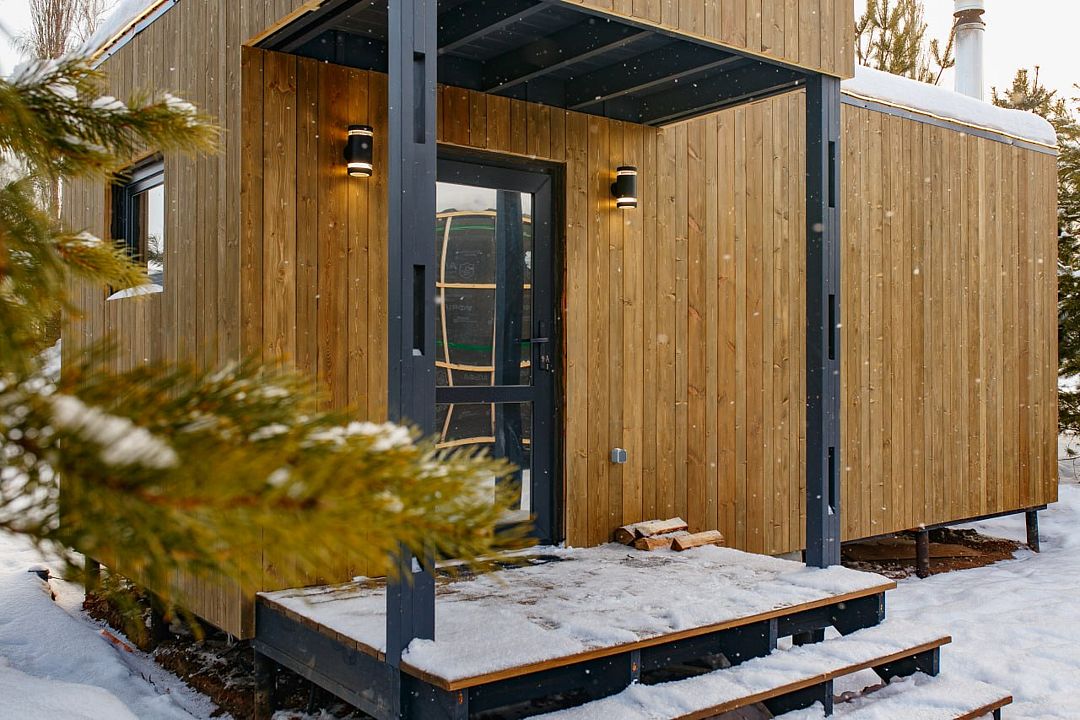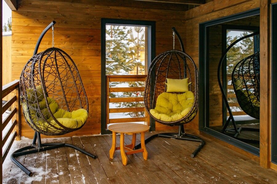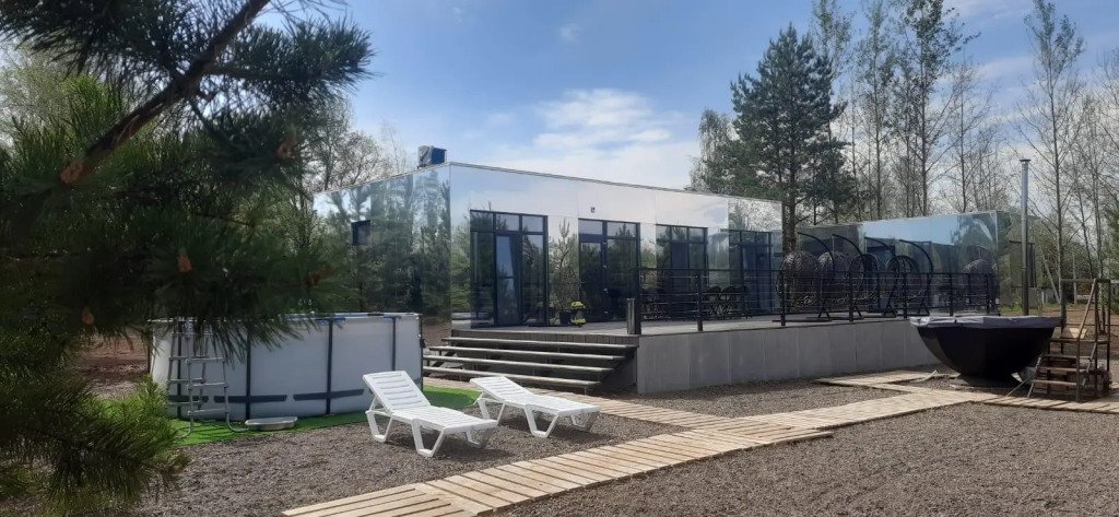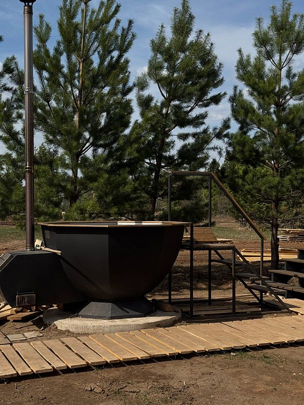 Панорамные окна, занимающие большую часть стен, открывают сказочный обзор на окружающий ландшафт, молодые сосны, а рядом с каждым домиком есть отдельная терраса с местом для отдыха, мангальной зоной и сибирским чаном.