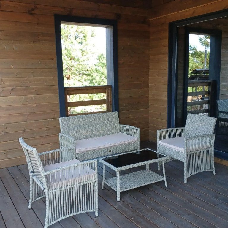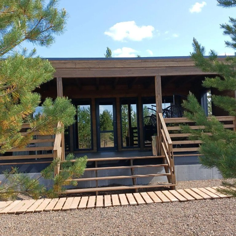 Из дома «Ретро» открывается роскошный вид на молодые сосны, а рядом с каждым домиком есть мангальная зона.
