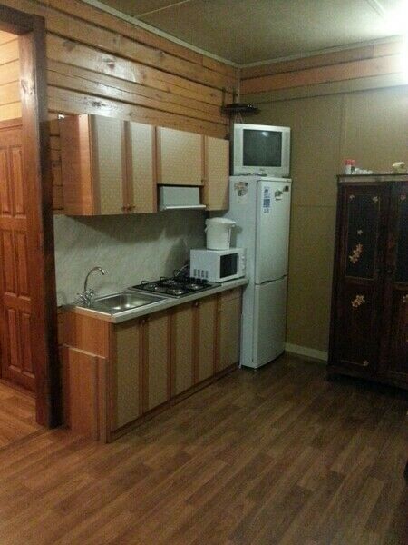 Две комнаты. В каждой комнате две раздельные кровати, стол, два стула. Общая кухня, душ, два туалета. На кухне: большой холодильник, газовая плита, микроволновая печь, электрический чайник, спутниковое телевидение.