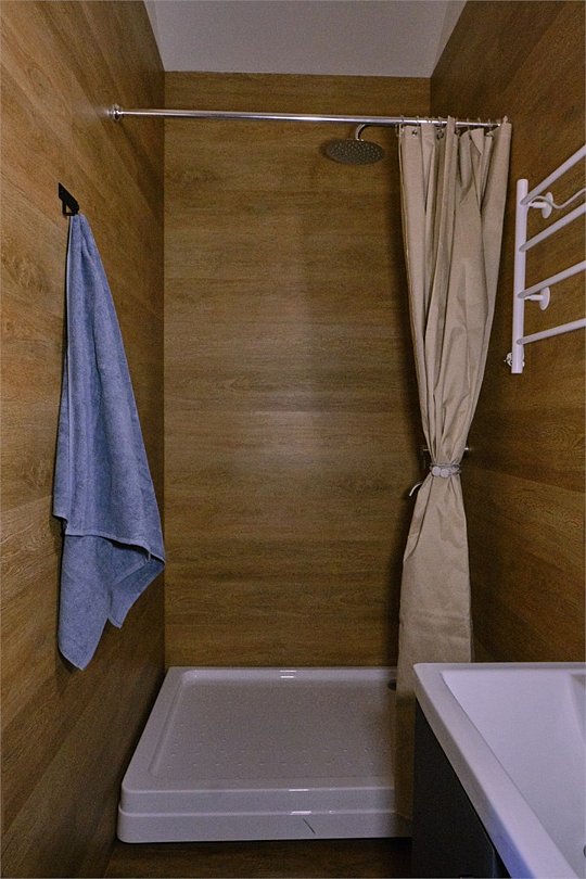 В ванной комнате: просторная душевая кабина, зеркало.