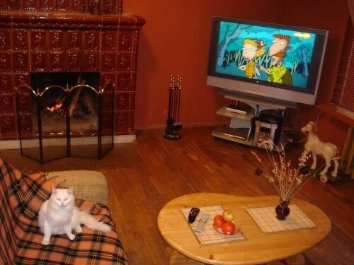 Банкетный зал-гостиная с камином (60 м. кв.): камин, большой плазменный телевизор, спутниковое TV, муз. центр, караоке, обеденный стол