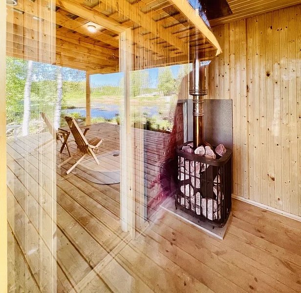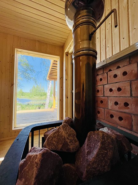 Насладитесь красотой природы и умиротворением в Русской бане с просторной террасой и панорамным остеклением, открывающим вид на залив реки Солоница.