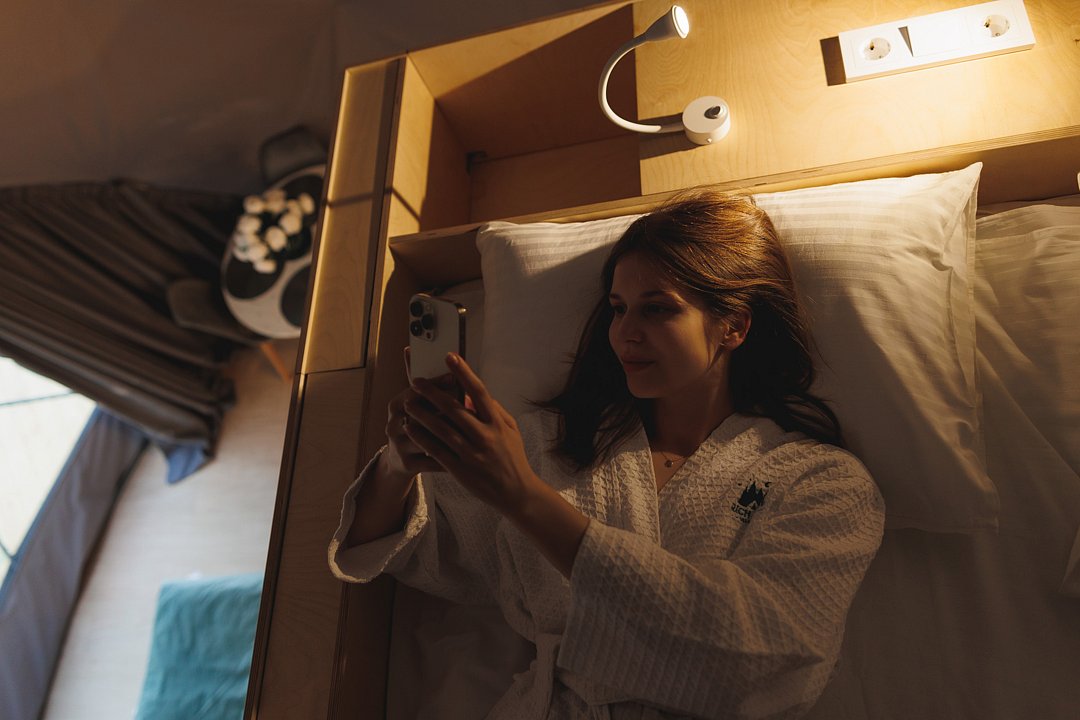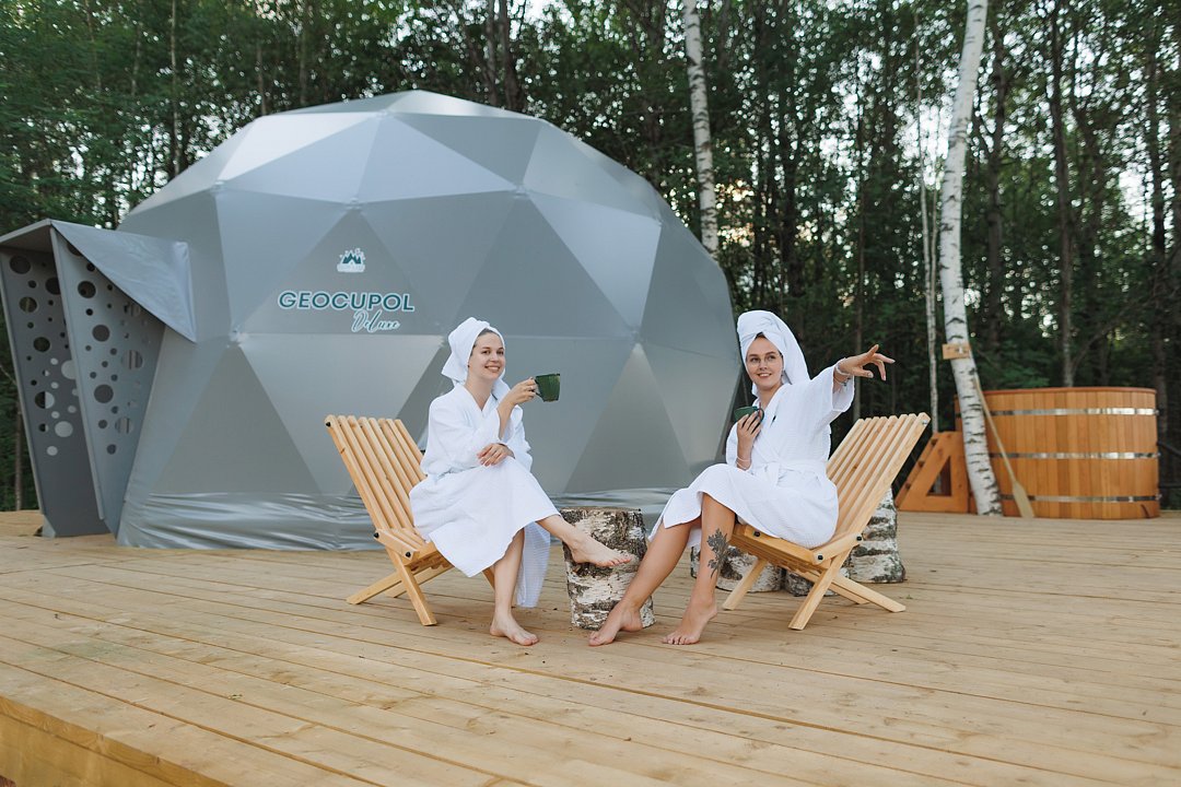 Просторный геокупол для 2–4 человек с двуспальной кроватью, полутороспальной кроватью и креслом-кроватью.