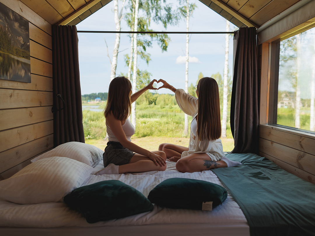 Уютный двухместный дом с панорамными окнами и террасой, где расположена японская купель Фурако с гидромассажем, предлагает живописный вид на реку Солоница. Внутри есть все для комфортного проживания: спальня с двуспальной кроватью, оборудованная кухня, санузел с теплым полом, Wi-Fi, телевизор со smart-tv, умная колонка с Алисой и зона с мангалом.