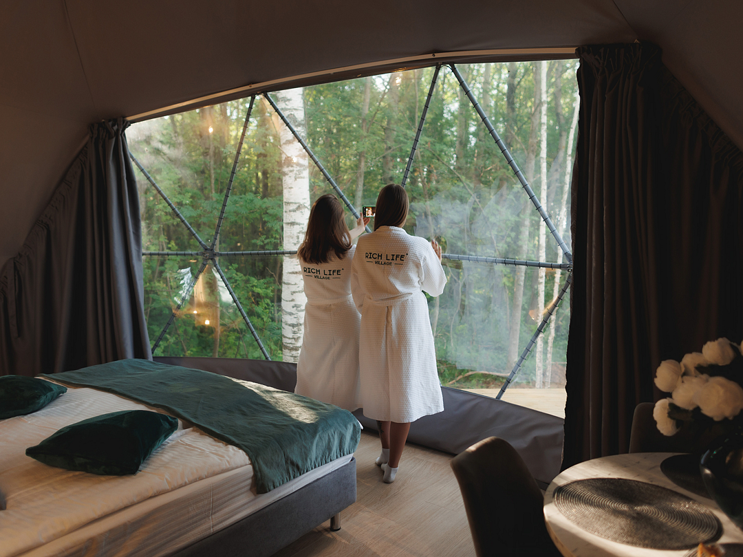 Погрузитесь в атмосферу европейского курорта в стильном эко-отеле »Rich Life Village», расположенном в коттеджном поселке Малые Соли, Ярославская область.