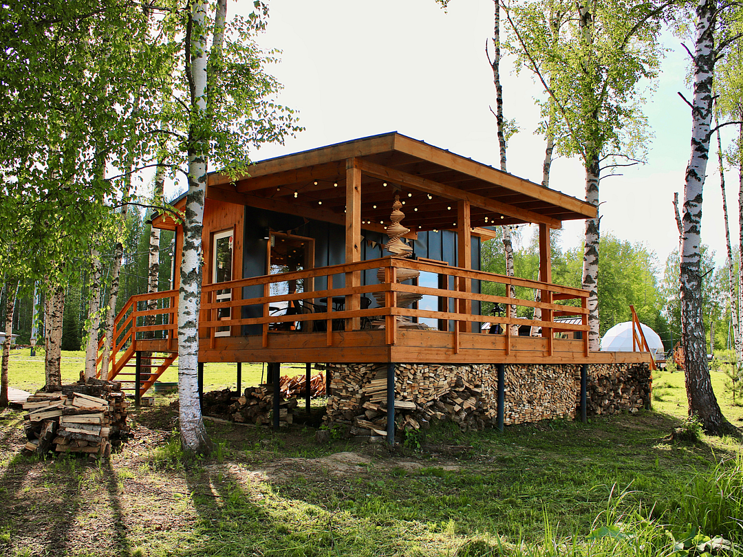В доме собственный санузел, мини-кухня и конвектор отопления. Панорамное окно выходит на собственную террасу с садовой мебелью. Рядом с домом расположена зона для мангала. В доме установлен телевизор со smart TV. Без ночевки возможно нахождение на территории более 4х человек.