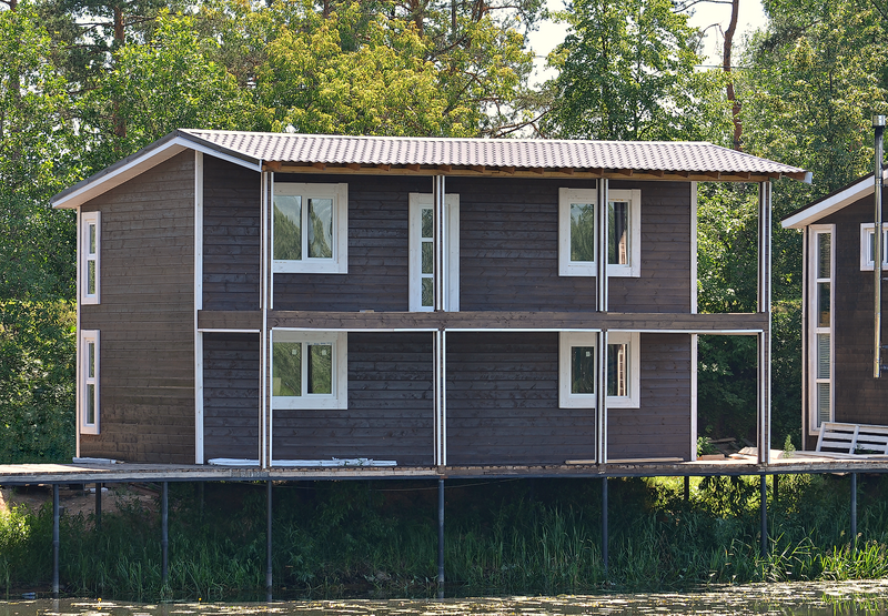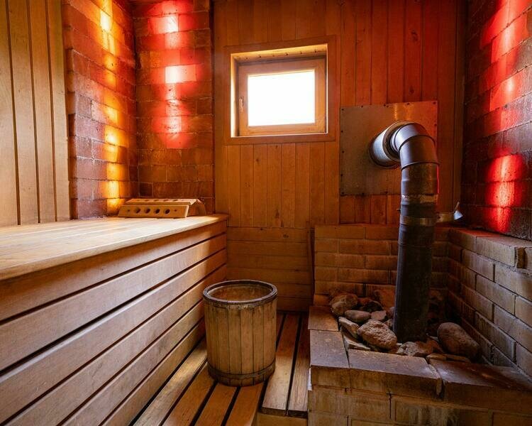 Понтонная баня на дровах рассчитана на 6 человек. После жаркой парной гости ныряют в ледяную прорубь, а в просторной комнате отдыха наслаждаются приятным общением и красивым видом из окон.