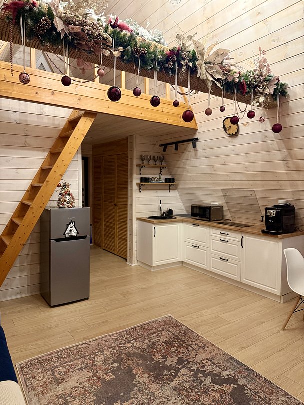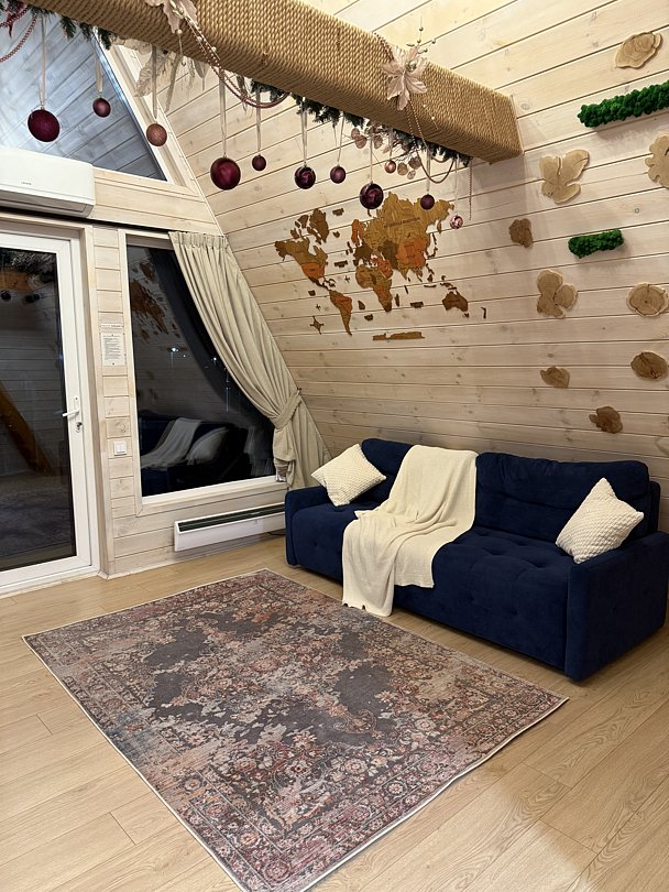 Комфортабельный А-фрейм оборудован всем необходимым для вашего удобства и уюта. Для приятного времяпровождения имеется уютная терраса и беседка с ротанговой мебелью. В распоряжении отдыхающих мангальная и костровая зоны, русская баня на дровах с купелью, банный чан с травами. Для маленьких путешественников оборудована детская площадка. Также на территории организована автопарковка с видеонаблюдением.