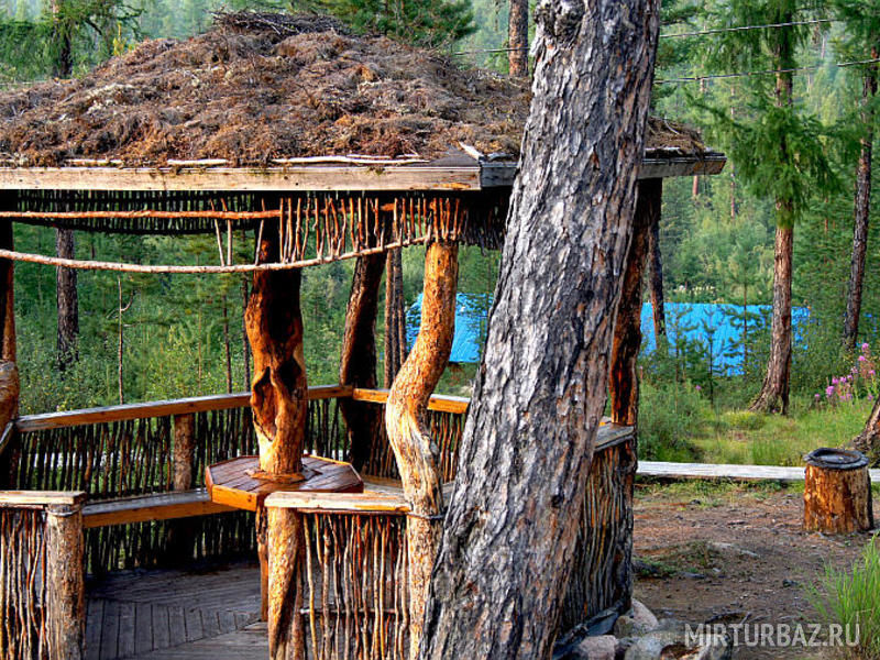 В сосновом лесу рядом с основными домиками расположились крытые деревянные беседки. Они идеально подходят для отдыха дружной компанией на свежем воздухе.