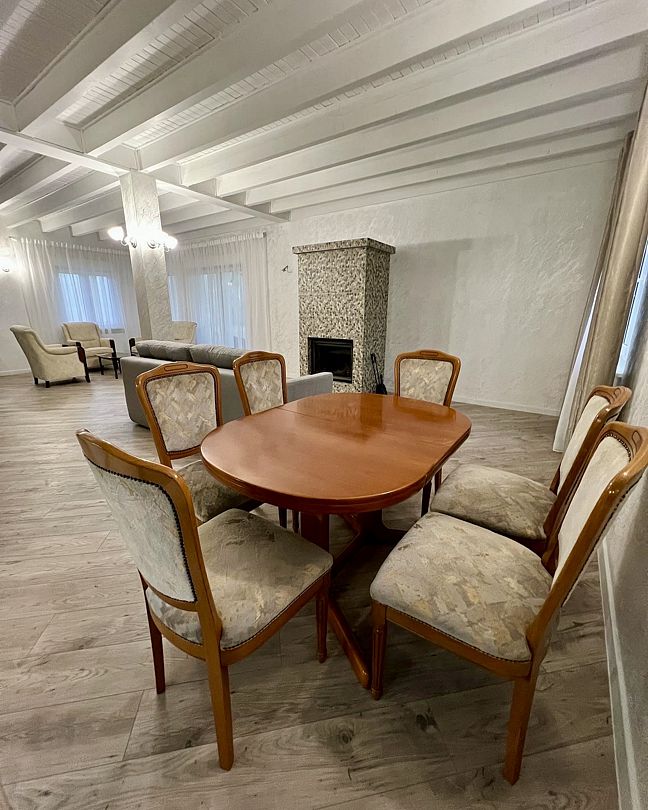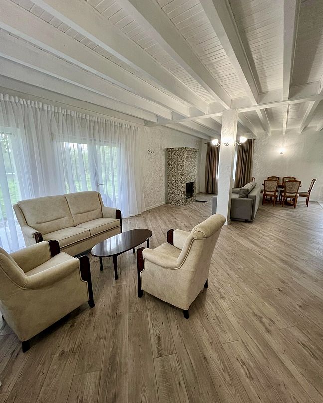 Для проживания сдаётся уютный гостевой дом 150 м2. На первом этаже просторная гостиная с камином, а на втором — три спальни и ванная комната.