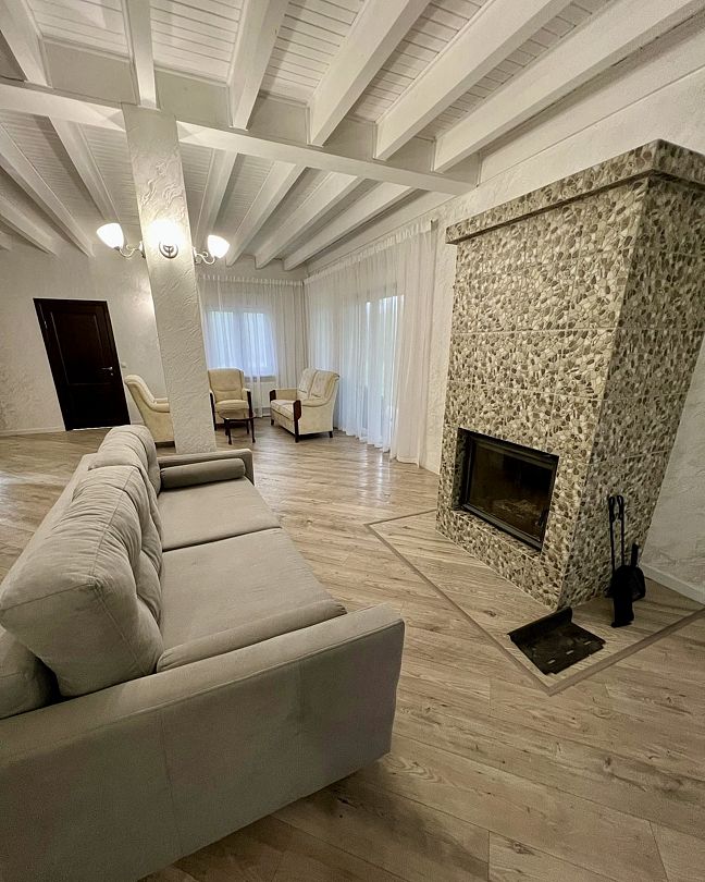 На первом этаже гостевого дома посетителей ждет уютная гостиная с камином, где можно приятно провести вечер в кругу близких. Также на этом этаже находится санузел. На втором этаже расположены три уютные спальни и ванная комната.