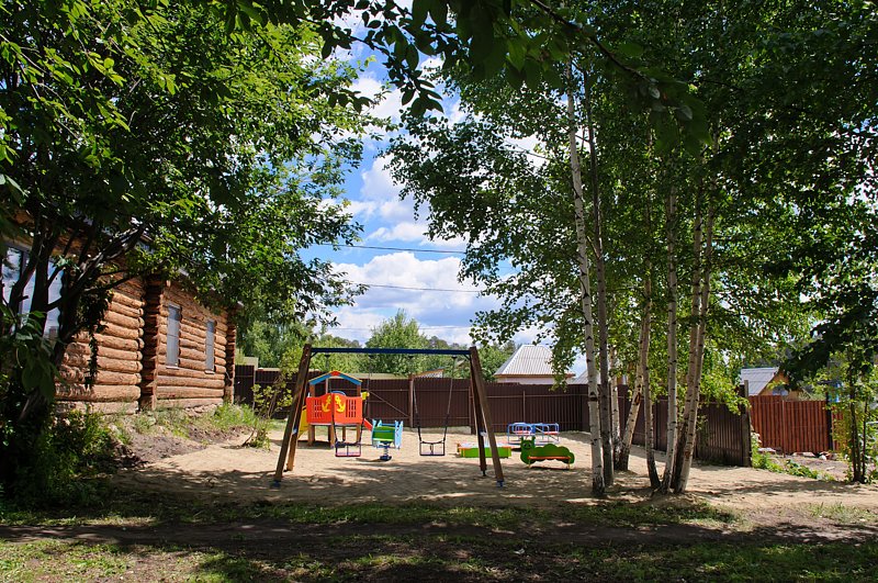 На территории есть большой батут, песочница, горка-кораблик, качели.